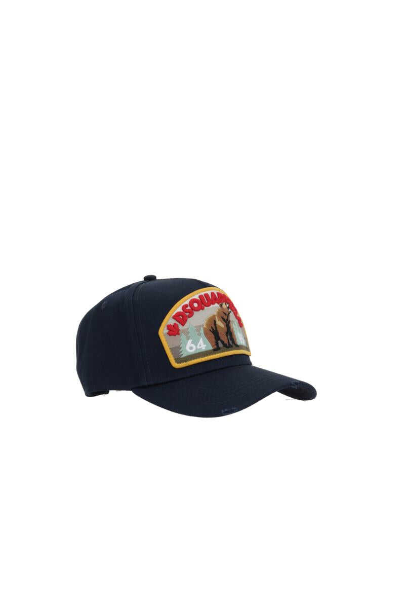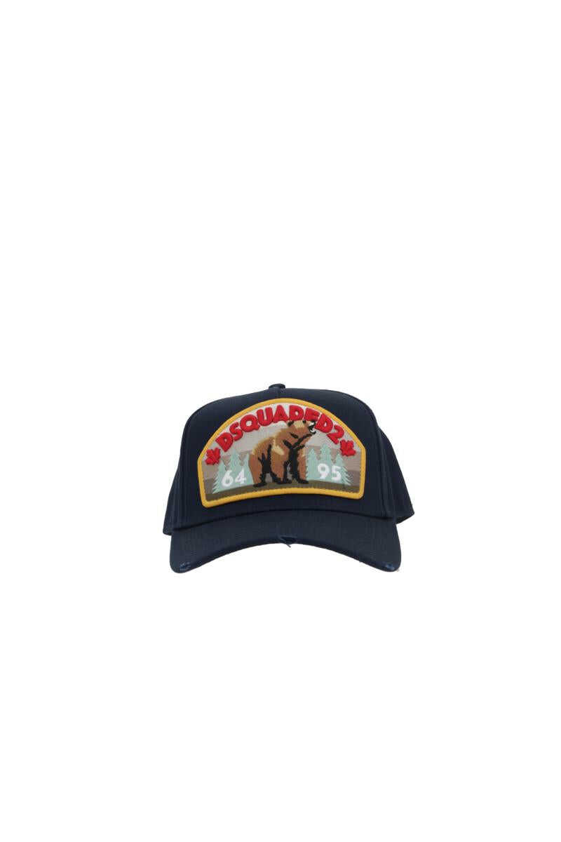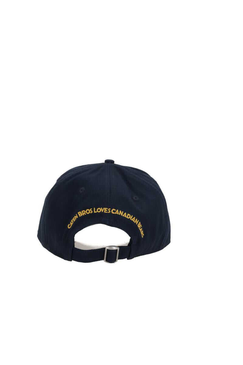 Dsquared2 baseball cap crafted from blue cotton gabardine with distressed effect, a graphic logo patch on the front and a "Caten Bros Loves Canadian Bears" embroidery on the back. It is characterized by an adjustable backstrap with a metal buckle and a lined interior.