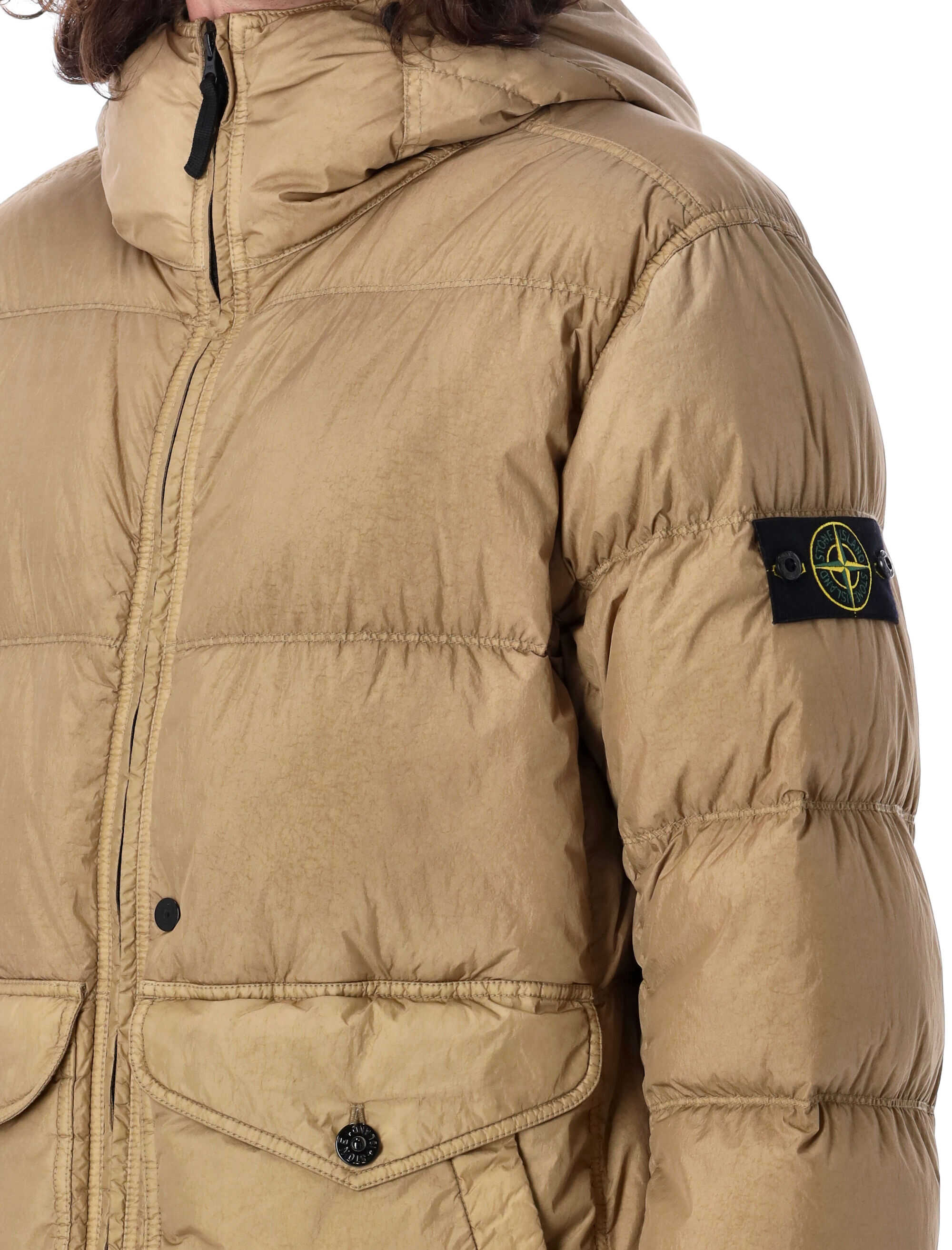 Stay warm and stylish in this BISCUIT colored Hooded puffer jacket by Stone Island. Made of 100% polyamide, it features an elasticised hood, front zip and button fastening, ribbed cuffs, and side zipped pockets. Complete your look with this iconic piece. Model is 1.90m and wears size L.