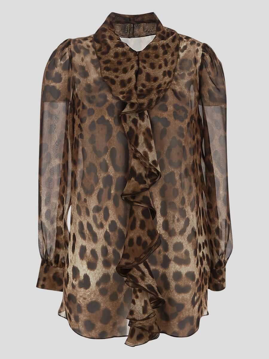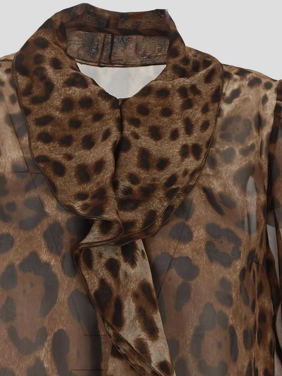 leopard-print silk blouse from DOLCE & GABBANA featuring brown, beige, black, silk, chiffon, all-over leopard print, semi-sheer construction, ruffled detailing, V-neck, bishop sleeves and long sleeves.
