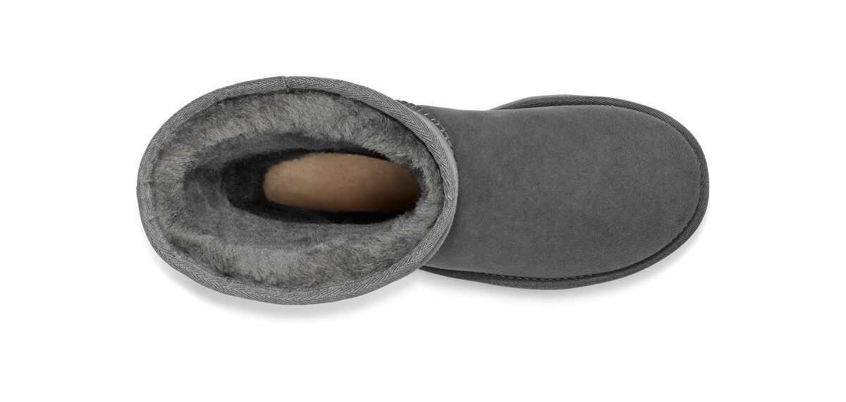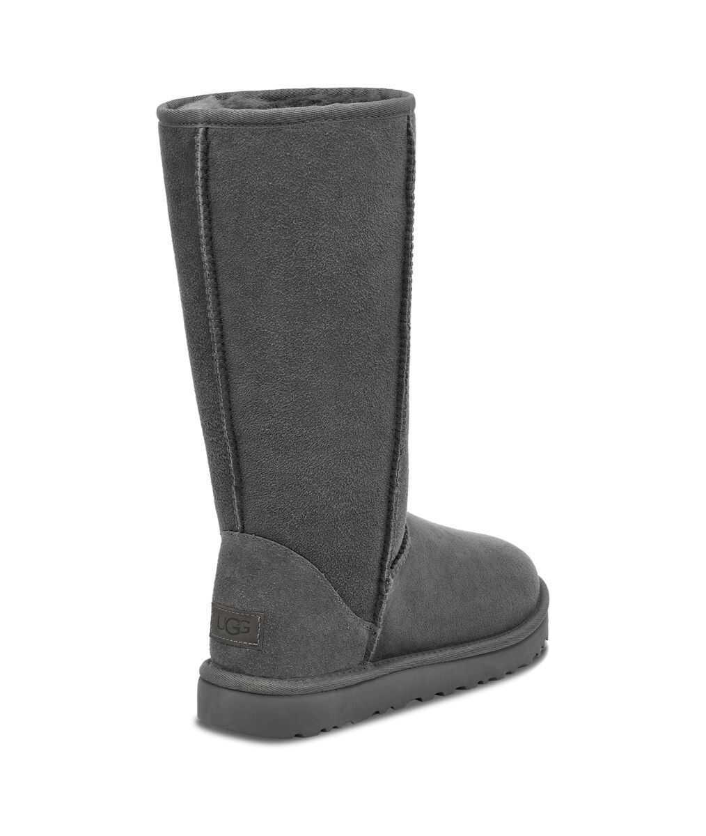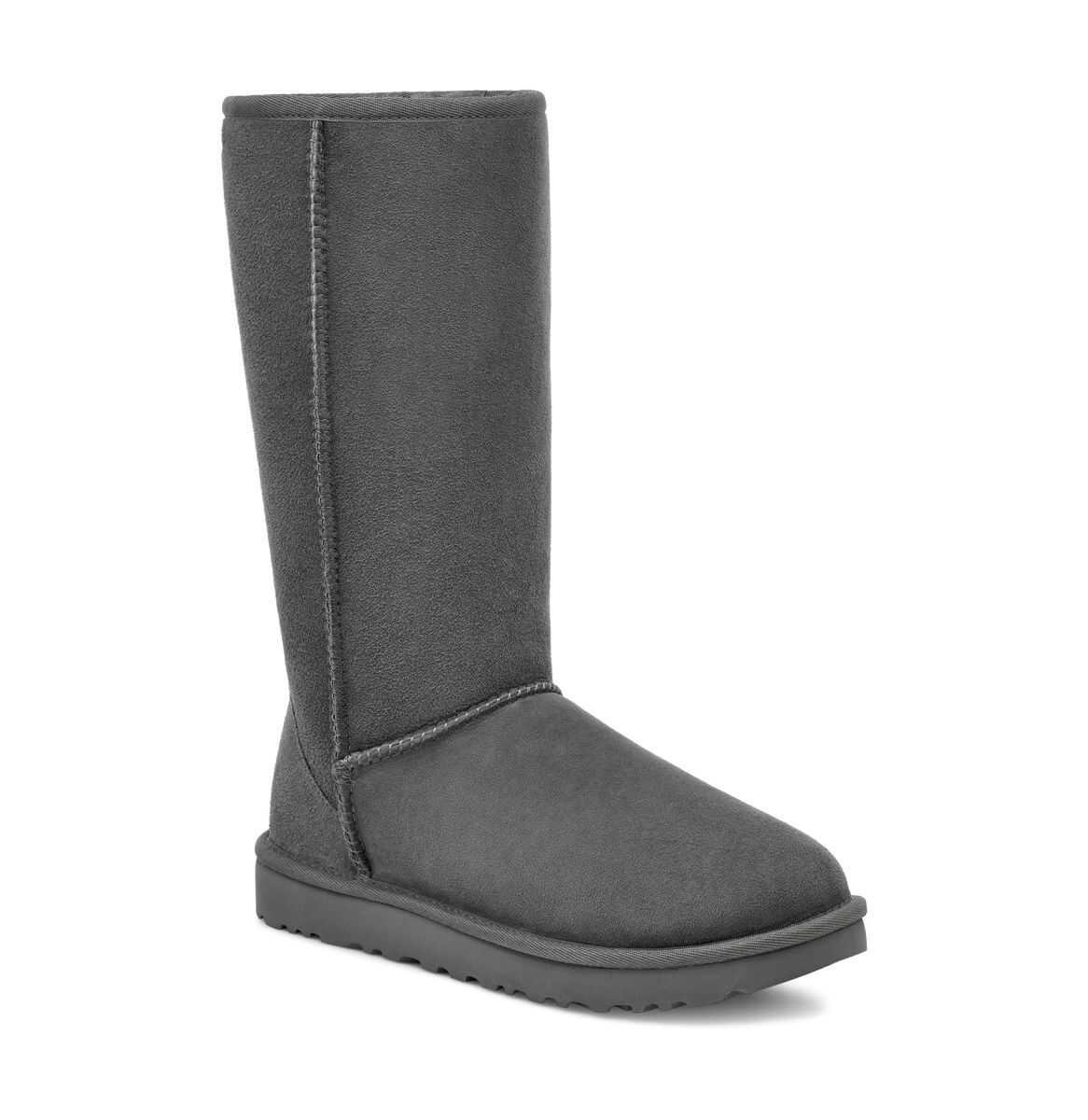 UGG boot made of sheepskin and suede, featuring overlock stitching, sheepskin insole, Treadlite by UGG™ sole, nylon trims, and a shaft height of 29.84 cm. US size chart.