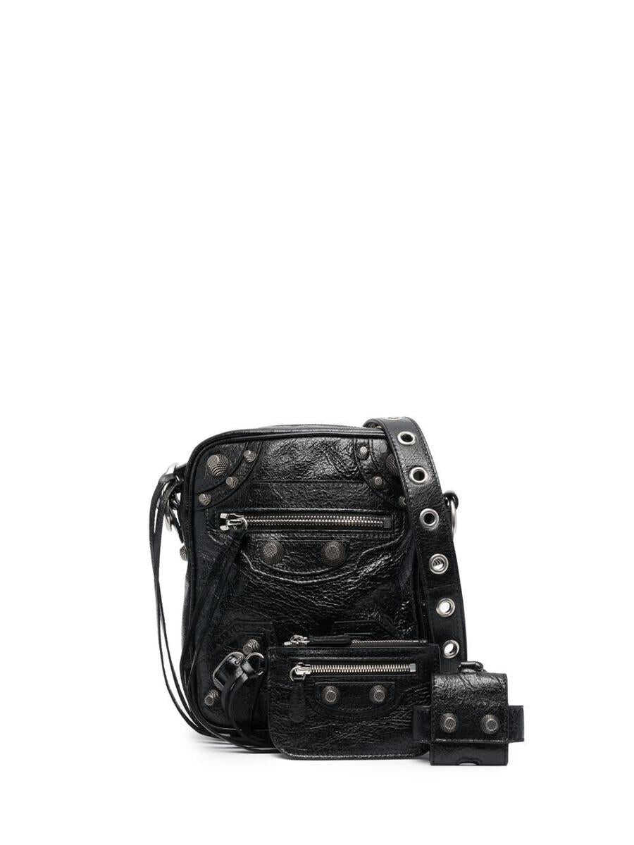 Le Cagole messenger bag from BALENCIAGA featuring black, calf leather, adjustable shoulder strap, gunmetal-tone hardware, eyelet embellishment, stud detailing, front zip-fastening pocket, top zip fastening, removable AirPods Pro holder and removable zipped pouch. Conscious: We've partnered with Good On You – an ethical agency that rates how sustainably brands perform. This item comes from a brand that performs well in relation to their impact on the planet..