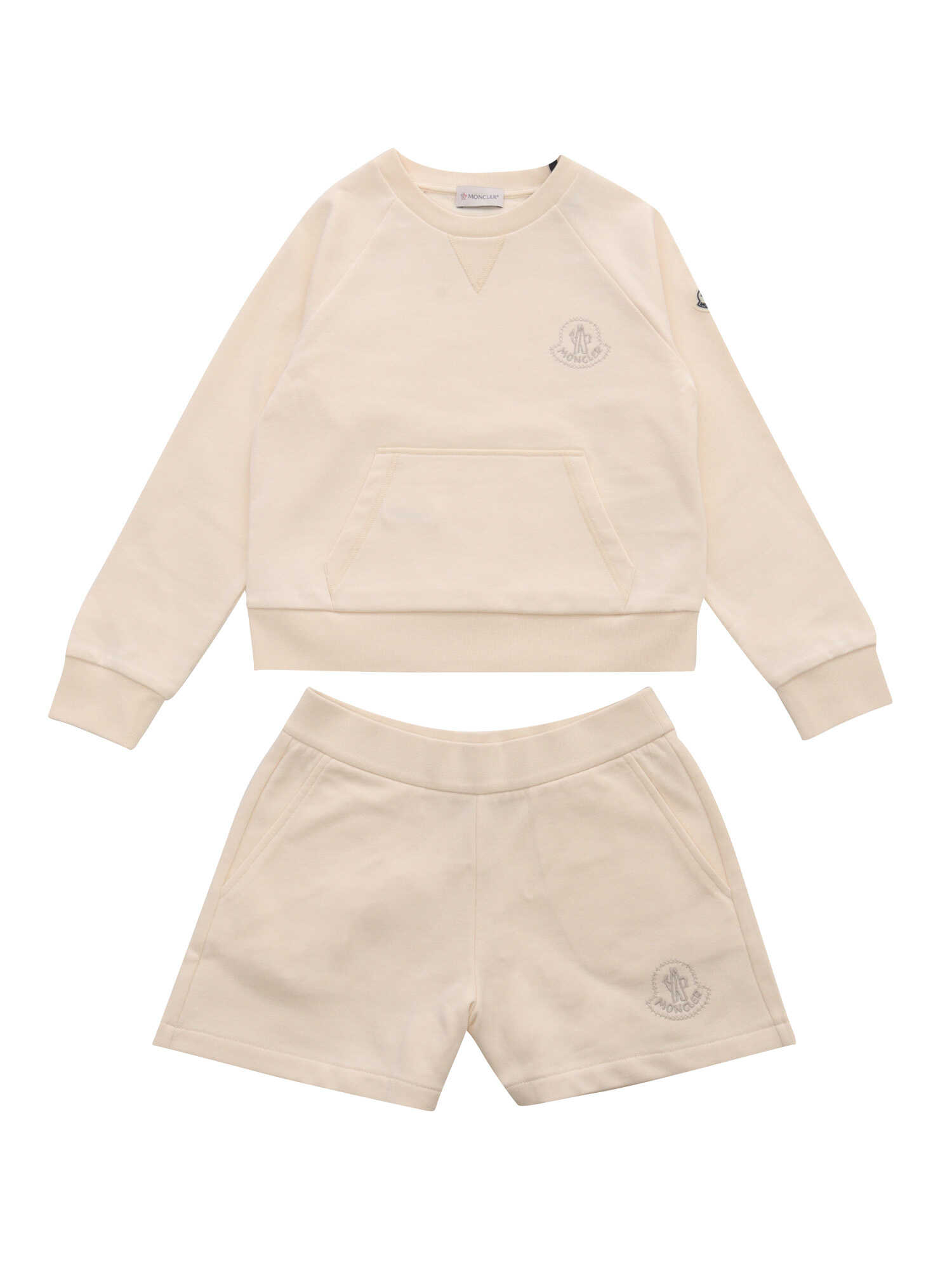 Unisex Moncler beige 2-piece sports suit with sweatshirt and shorts, tone-on-tone stitched logo.