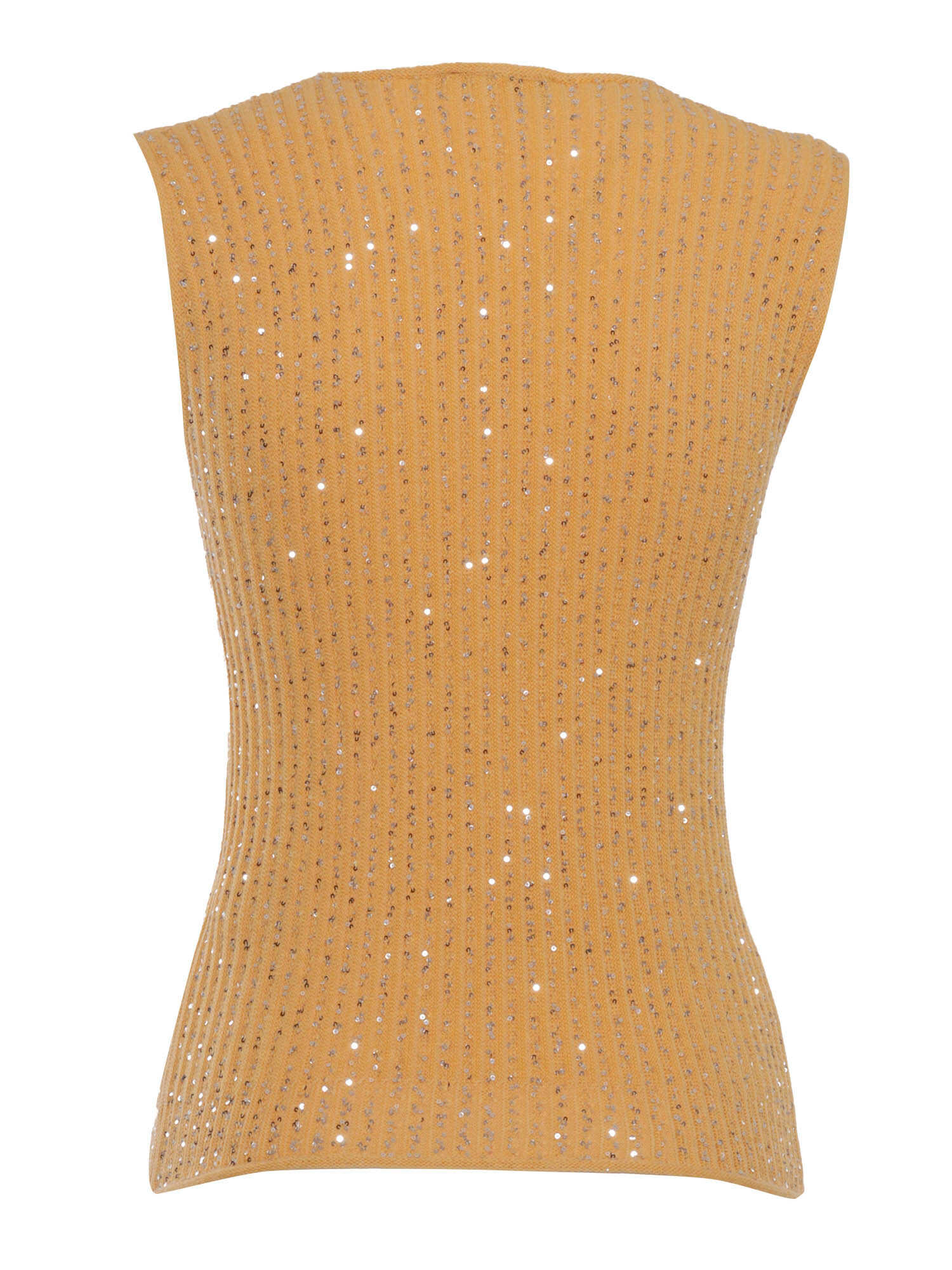 Sleeveless top, ribbed cotton yarn with all over sequin thread, crew neck.