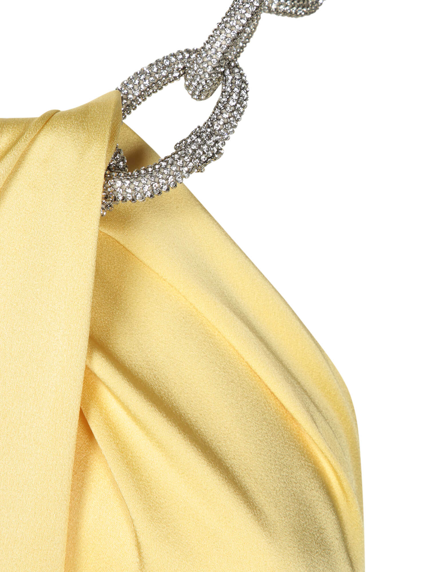 Elevate your elegance with this stunning yellow satin dress by Stella McCartney. Featuring a luxurious halter neck and exquisite crystal embellishments, this flowing silhouette promises to turn heads at any occasion. Feel confident and chic!