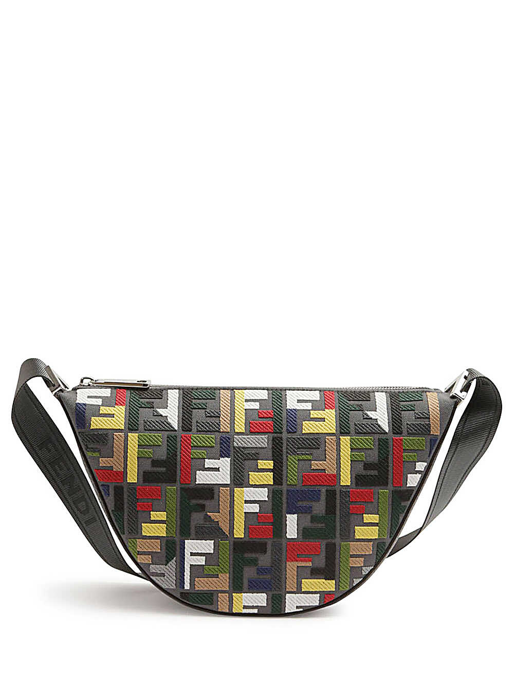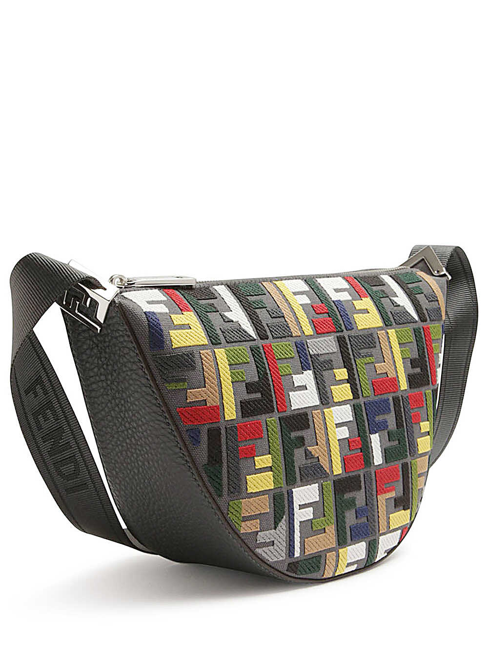 Fendi Melon Small FF Canvas bag with multicolor FF embroidery Fendi Melon Messenger small size, with a crescent shape. Made of dark gray canvas with iconic FF motif embroidered in relief with multicolor thread. Decorated with metal FF application on the corners. Dark gray leather bottom. Equipped with zip closure and metal accessories with palladium finish. Adjustable crossbody shoulder strap in technical fabric finished with FENDI lettering. Made in Italy Measures: Height: 18 cm Depth: 10 cm Width: 33 cm Weight: 0.45 kg
