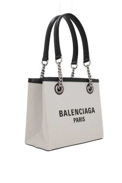 small Duty Free tote bag from BALENCIAGA featuring light beige, black, canvas, logo print to the front, leather trim, two leather and chain-link top handles, open top and main compartment. We've partnered with Good On You — an independent agency that rates how brands perform in relation to their impact on the planet, people and animals, with a multi-criteria rating simplified to a five points scale. In order to be awarded our conscious label, larger brands need to score a minimum of four out of five ('Good'), while smaller brands must score at least three out of five ('It's a start'). This item comes from a brand rated four out of five ('Good') by Good on You. Please note, this is a brand-level rating and does not guarantee that this product is made with conscious materials.. Learn more about what makes a product Conscious on our Conscious Criteria page.