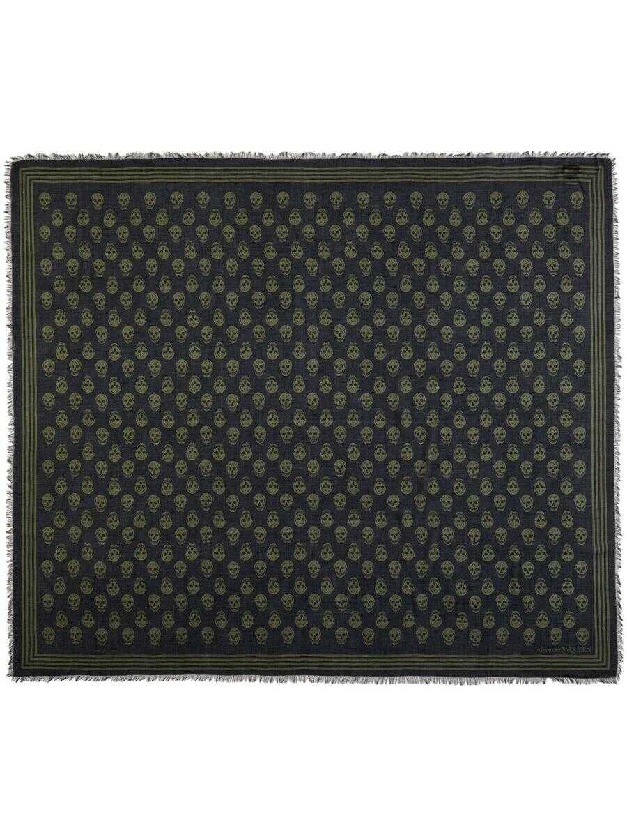 skull-print frayed scarf from Alexander McQueen featuring black, khaki, modal, skull print, two-tone design, square shape and frayed edge. This item contains at least 50% materials which are certified or widely recognised as having a lower environmental impact through production and/or manufacturing processes that reduce water consumption and the use of harmful chemicals, or re-use by-products of the production process.. Learn more about what makes a product Conscious on our Conscious Criteria page.