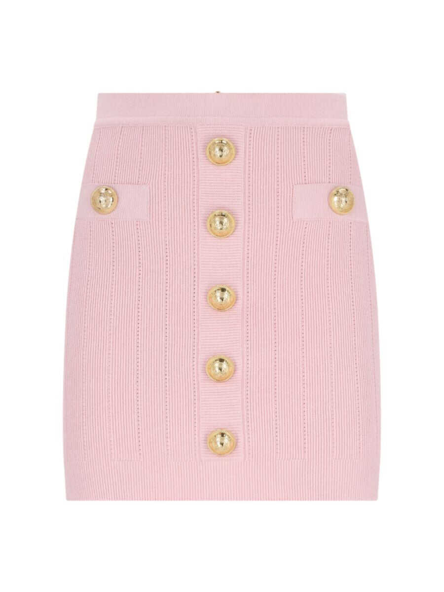 light pink knitted construction faux pocket detail embossed gold-tone buttons ribbed trim high waist rear zip fastening straight hem thigh-length