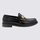 Black loafers from Moschino featuring round toe, frontal gold tone logo, leather sole and details.