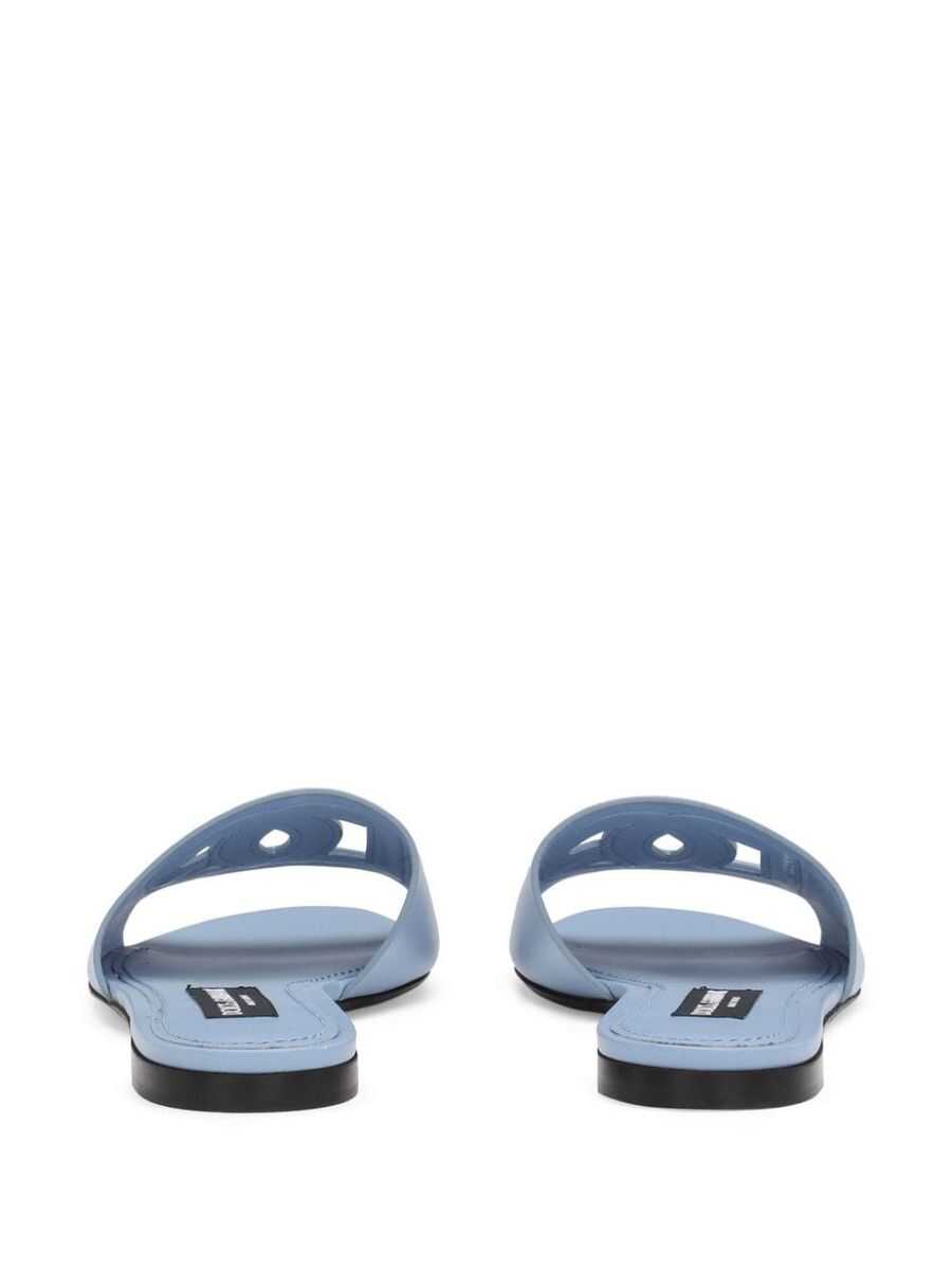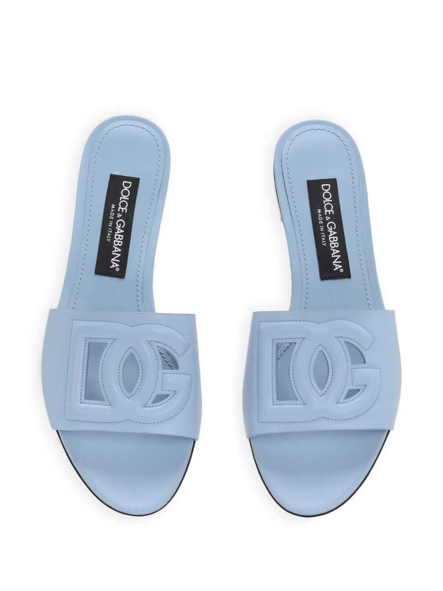 light blue leather smooth grain embossed logo to the front tonal stitching cut-out detailing almond open toe branded footbed low stacked heel leather sole slip-on style