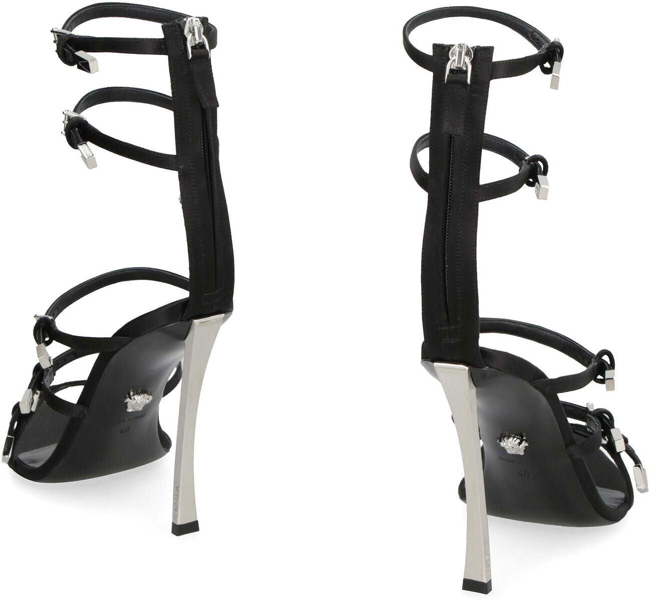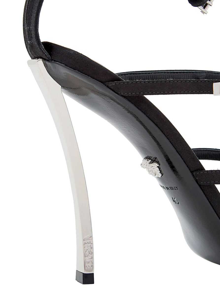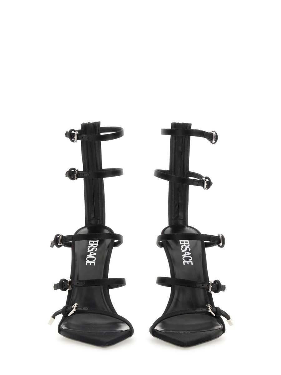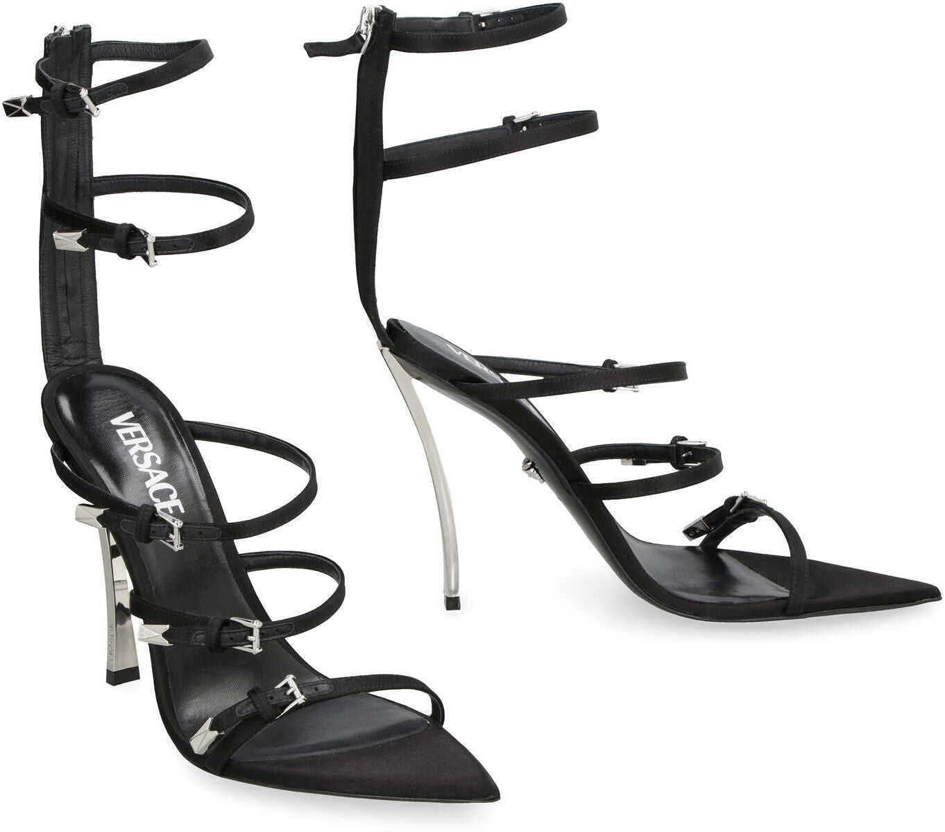 Black leather Pin-Point sandals from Versace featuring almond toe, stiletto heel, silver tone metal hardware, adjustable multi straps on leg and zip closure at back.