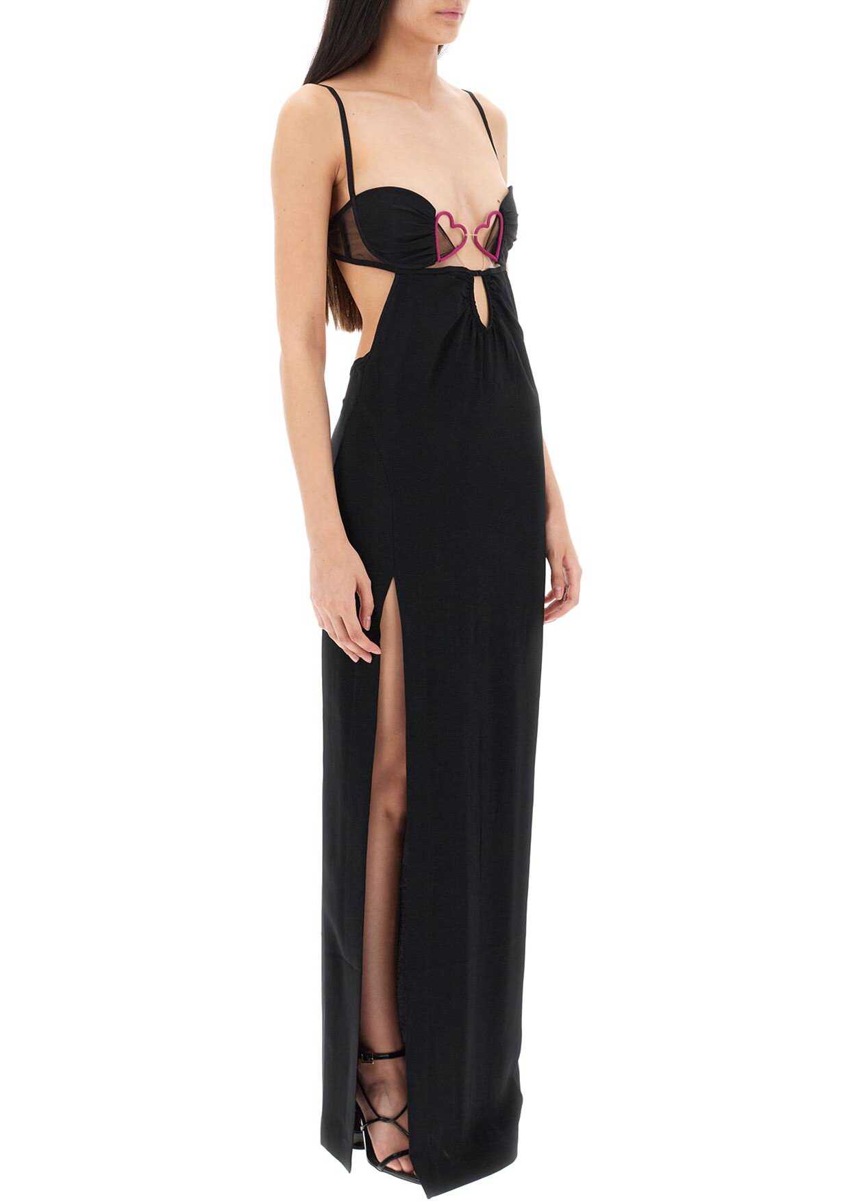 Nensi Dojaka long dress crafted in viscose crepe featuring cut-out at front and heart-shaped detail at chest. Padded cups, mesh inserts, hook and zipper closure at back, sweetheart neckline, deep side slit. The model is 177 cm tall and wears a size S.