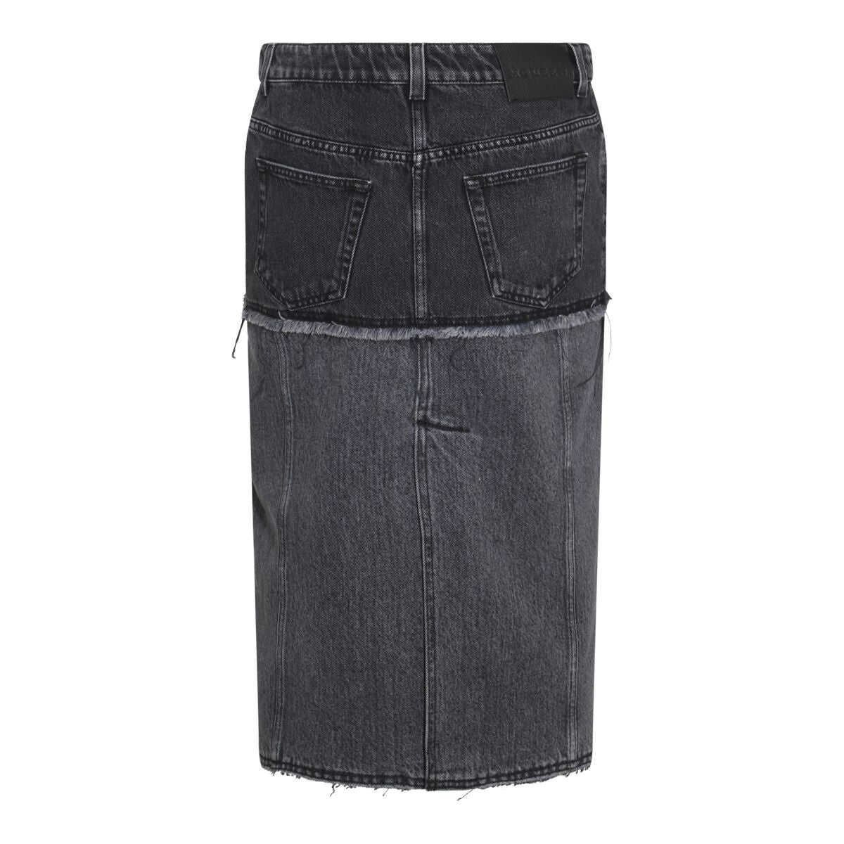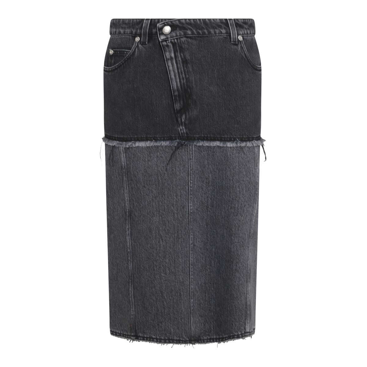 Black and grey cotton skirt from Alexander McQueen featuring frontal zip and button, belt loops and midi length.