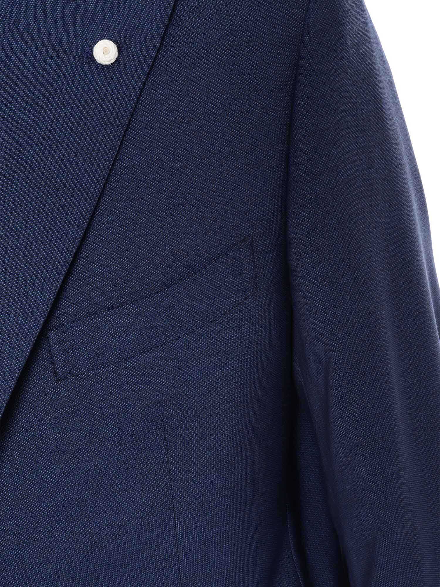 Bright blue men's suit in cool wool with welt pockets, single front buttons, lapel collar, fitted trousers.