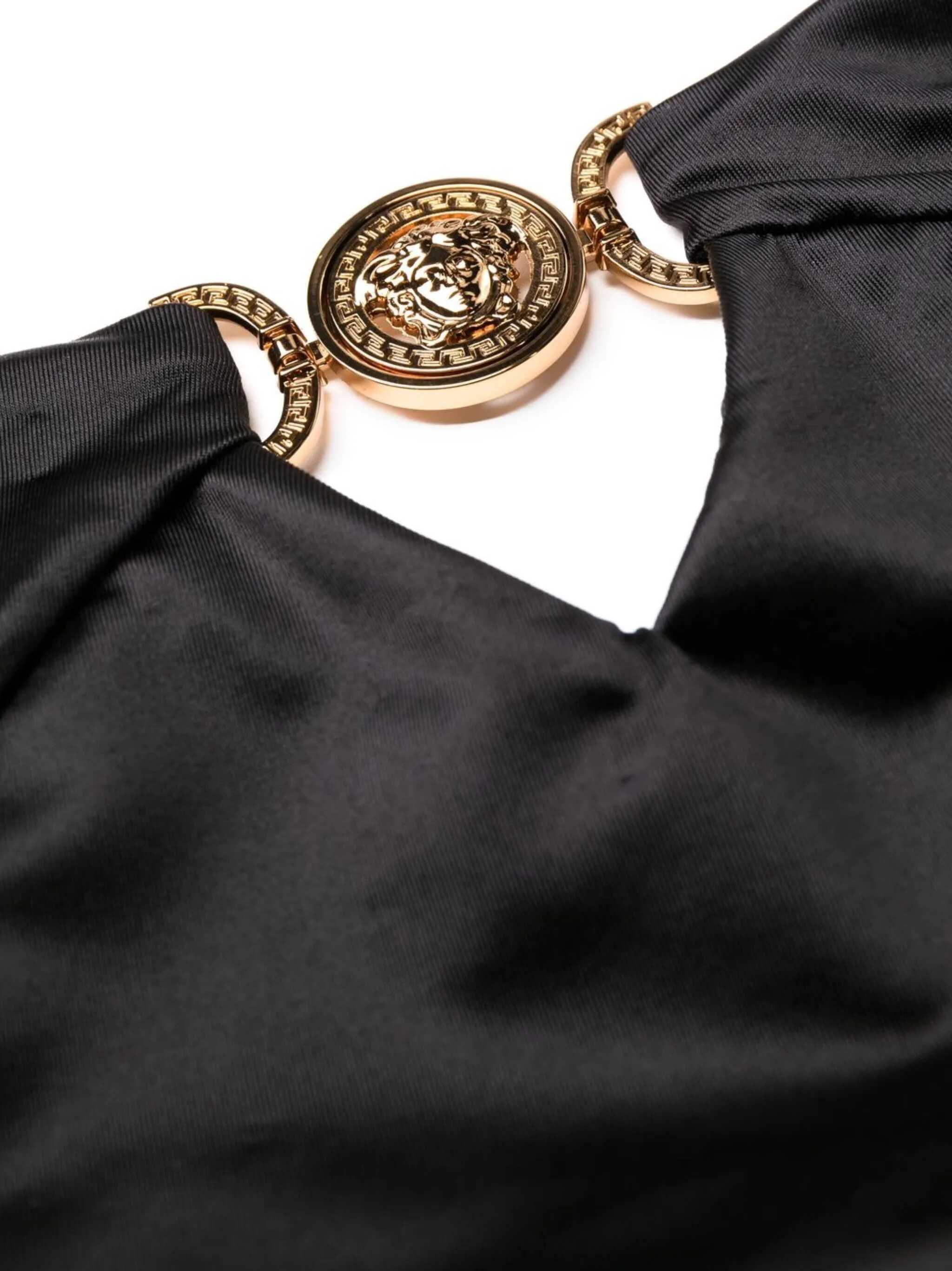 Belize fabric one piece swimsuit featuring a front weave, fastening at the neck and a 'Medusa' gold metal detail