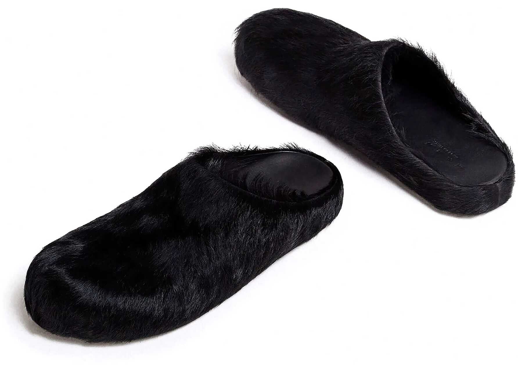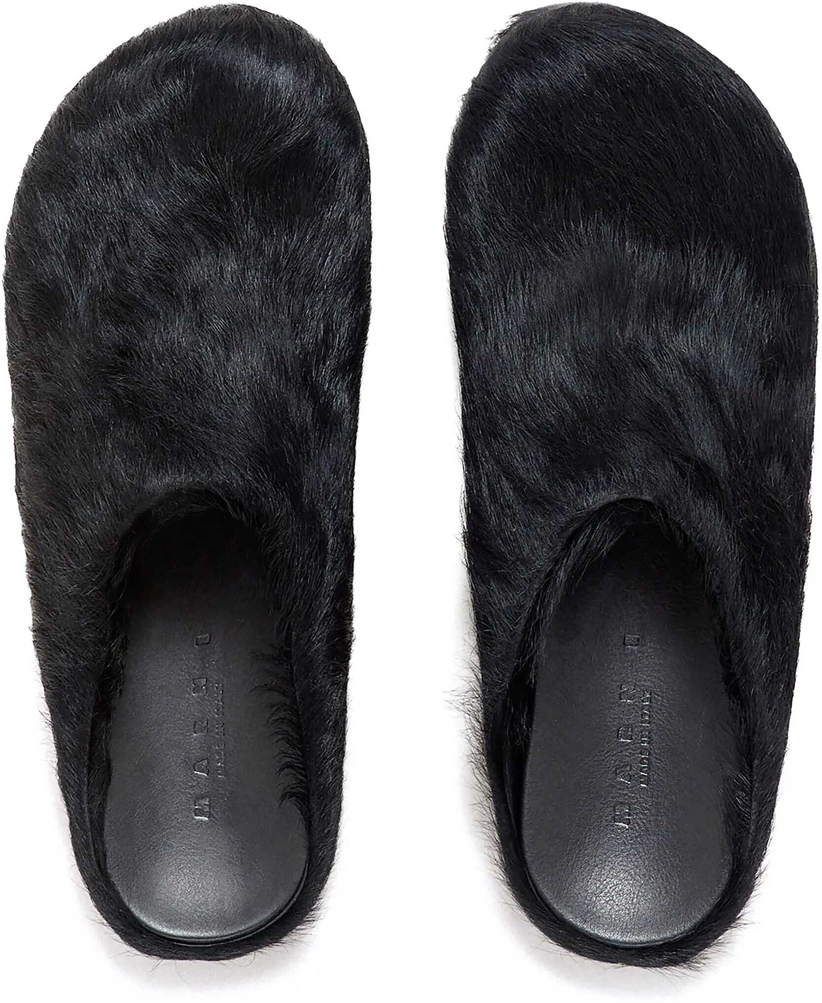 The leather Fussbett Mules by Marni features a slip-on style with a closed front, enriched by an original design in colored fur that adds an eccentric and contemporary touch. The flat sole and the anatomical leather insole guarantee comfort and support, making this sabot a perfect balance between style and functionality.