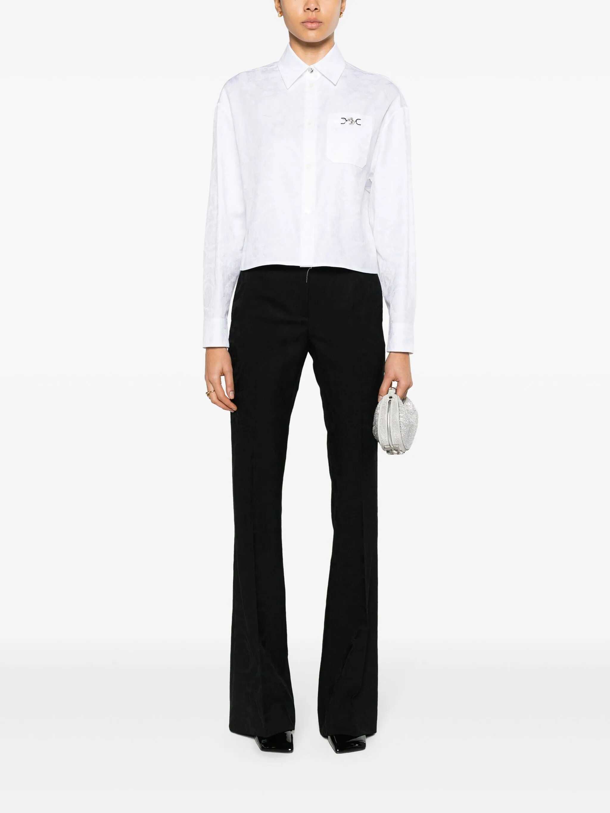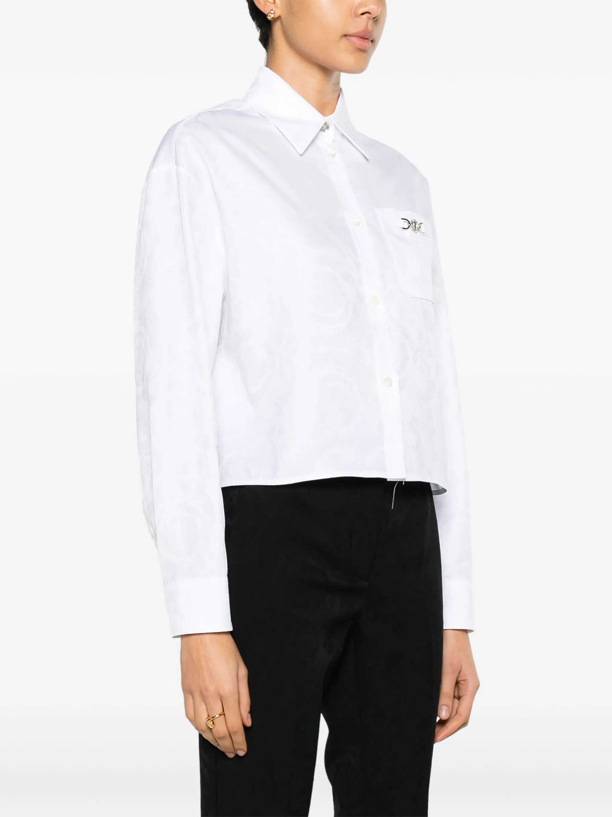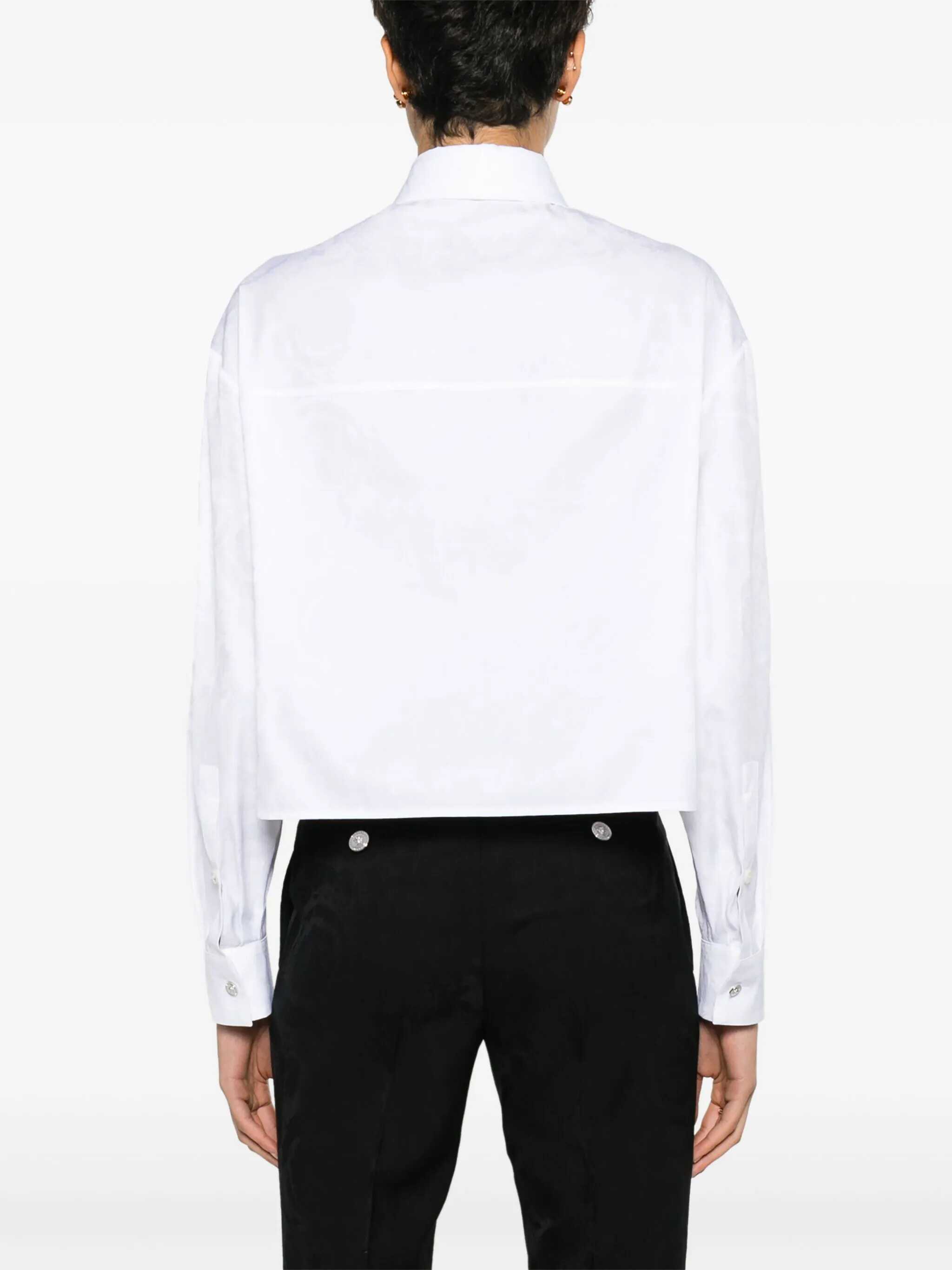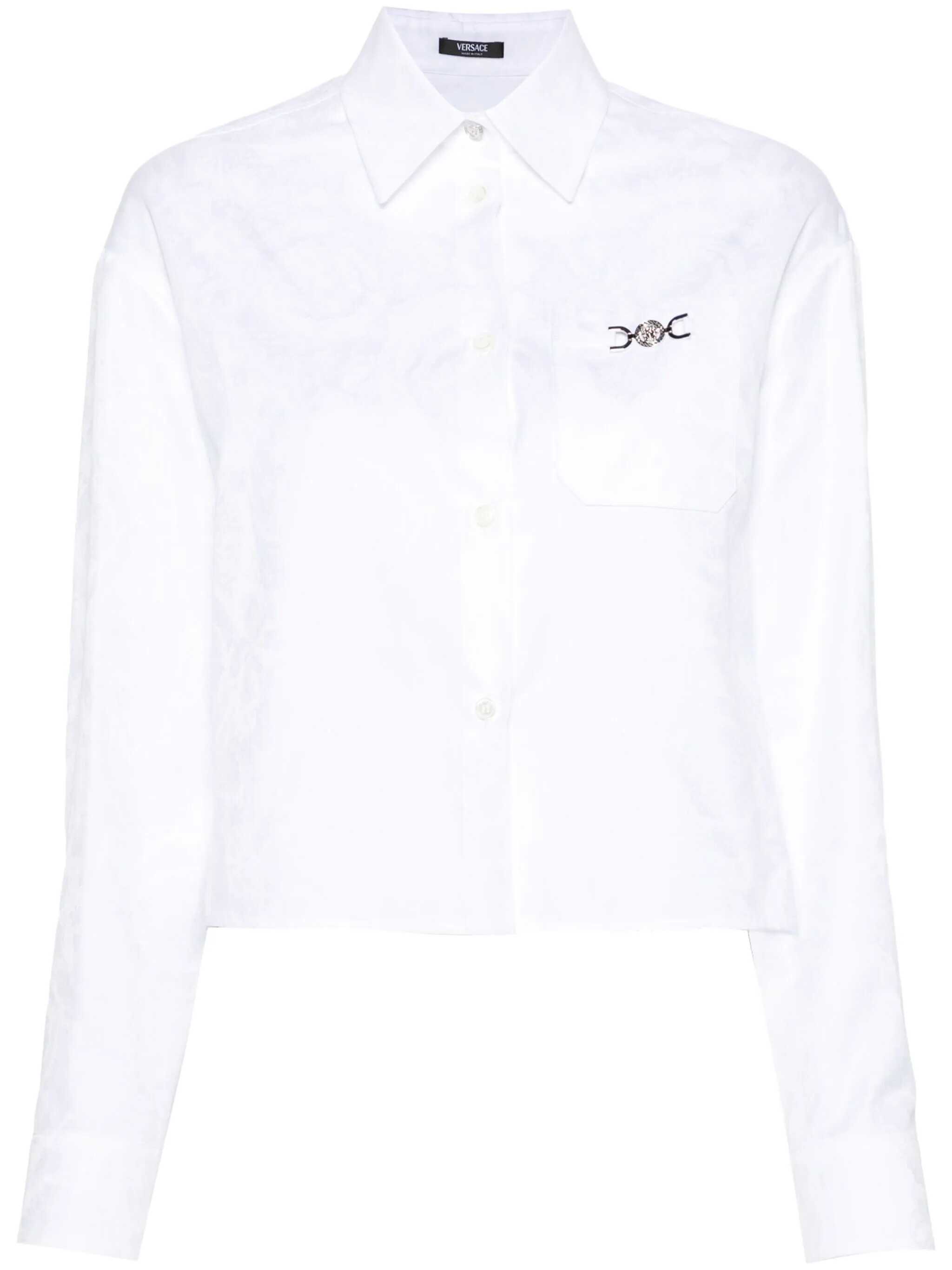 white cotton poplin texture baroque-pattern jacquard Medusa plaque detail pointed flat collar front button fastening drop shoulder long sleeves buttoned cuffs chest patch pocket straight hem unlined