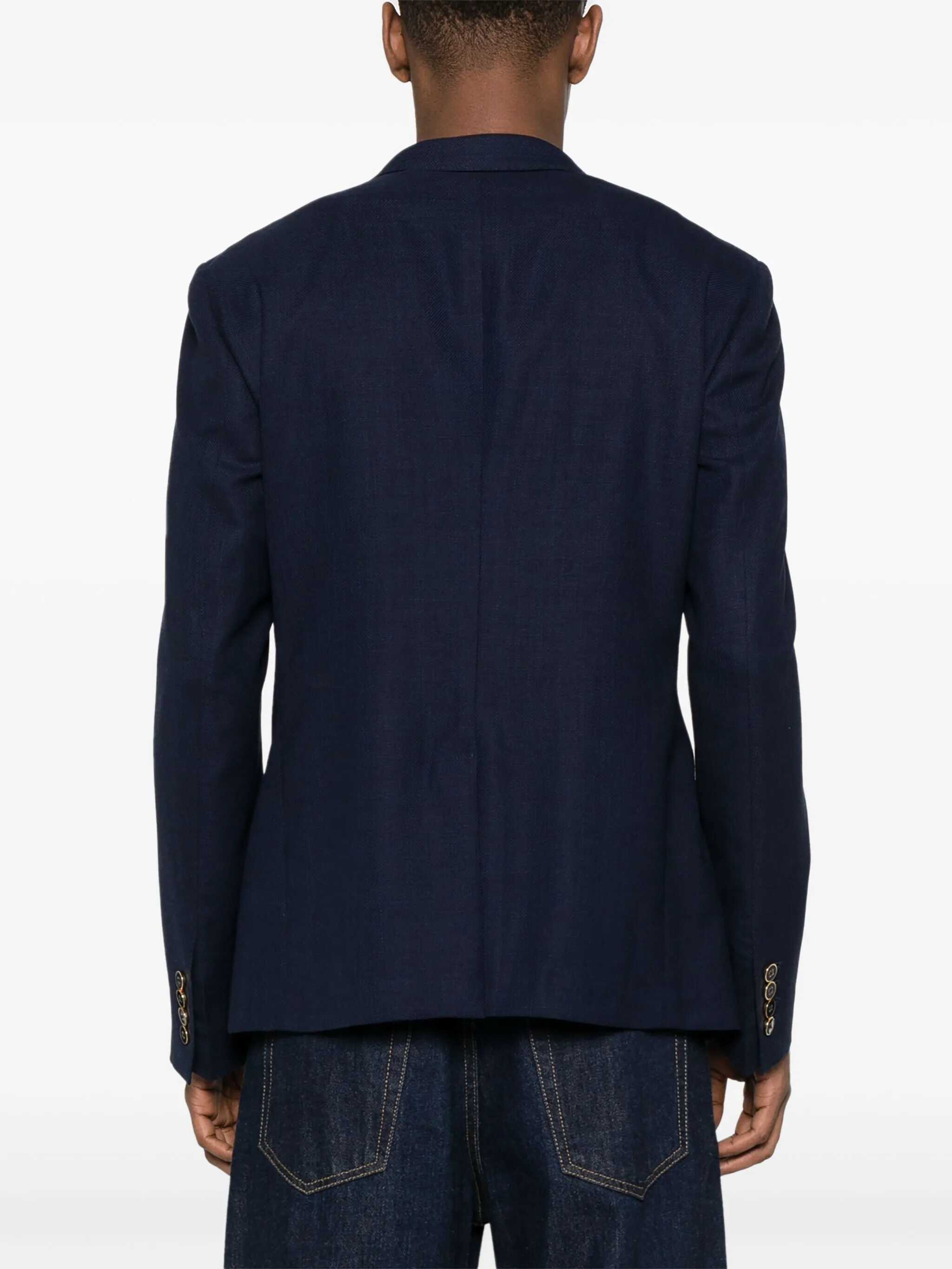 Navy blue wool blazer from Dolce & Gabbana featuring peak lapels, long sleeves, buttoned cuffs, chest welt pockets, two front flap pockets, multiple internal slip pockets, double-breasted button fastening and straight hem.
