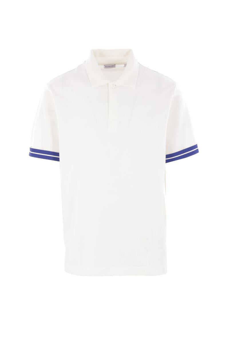 Burberry polo shirt crafted from white cotton piquet with contrasting side stripes. Featuring a polo collar, concealed front button placket with two buttons, short sleeves with contrasting turn-ups and Equestrian Knight Design print, and a straight hem.