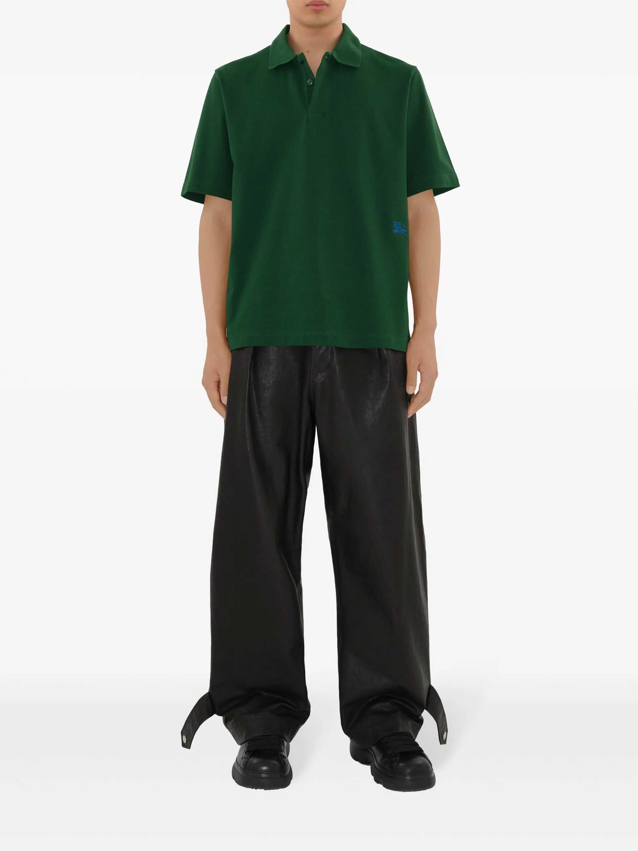 Burberry polo shirt crafted from dark green cotton piqué, featuring a contrasting embroidered Equestrian Knight Design logo. Designed with a polo collar, concealed two-button placket, short sleeves, and a straight hem.