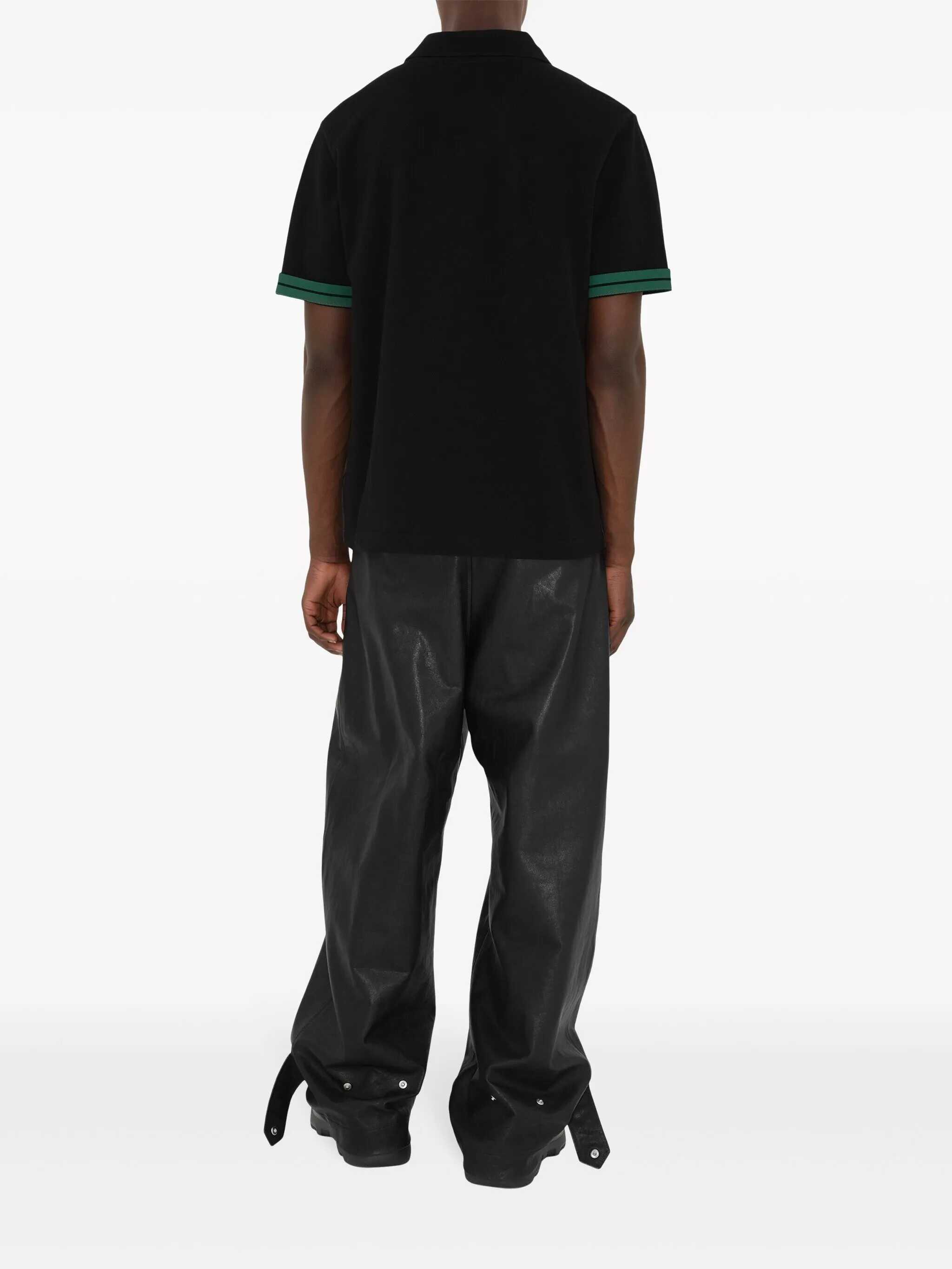 Burberry polo shirt crafted from black cotton piquet with contrasting side stripes. Featuring a polo collar, concealed front button placket with two buttons, short sleeves with contrasting turn-ups and Equestrian Knight Design print, and a straight hem.