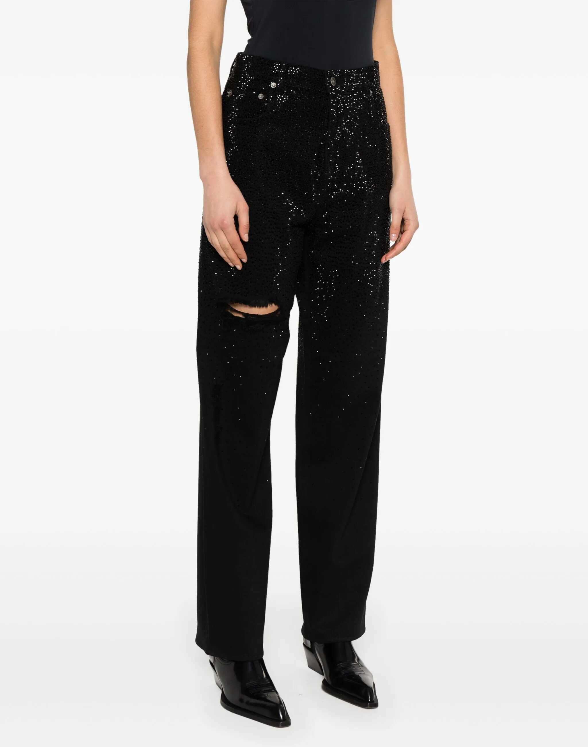 Cotton Kim Pants by Golden Goose, featuring a low-waisted five-pocket design, a front button and zipper closure, waistband loops, an iconic branded signature leather patch with press-stamped applique at the back, a monochrome pattern with all-over shiny moniline details, a frayed cut-out detail at the front panel, and a regular fit.