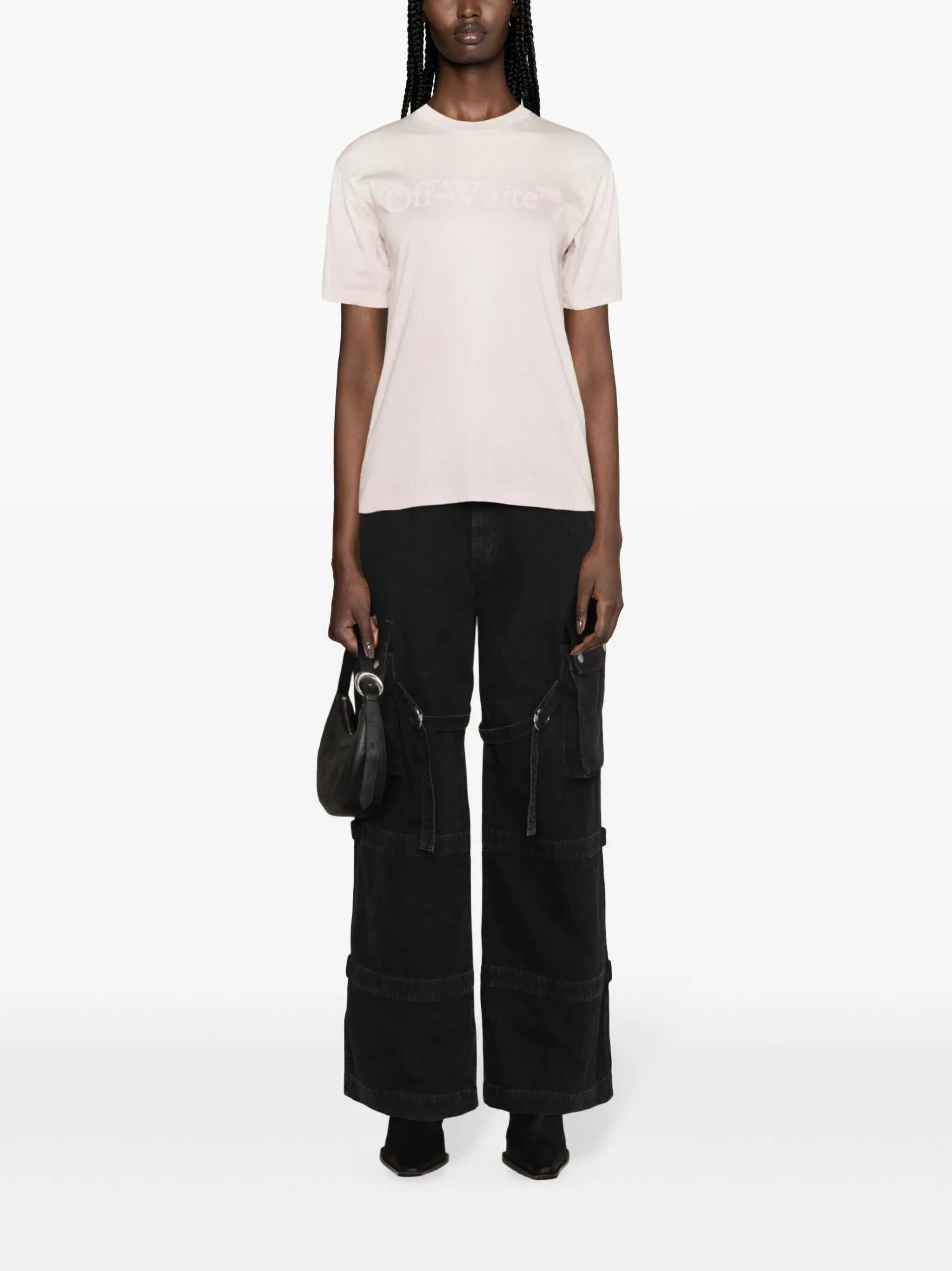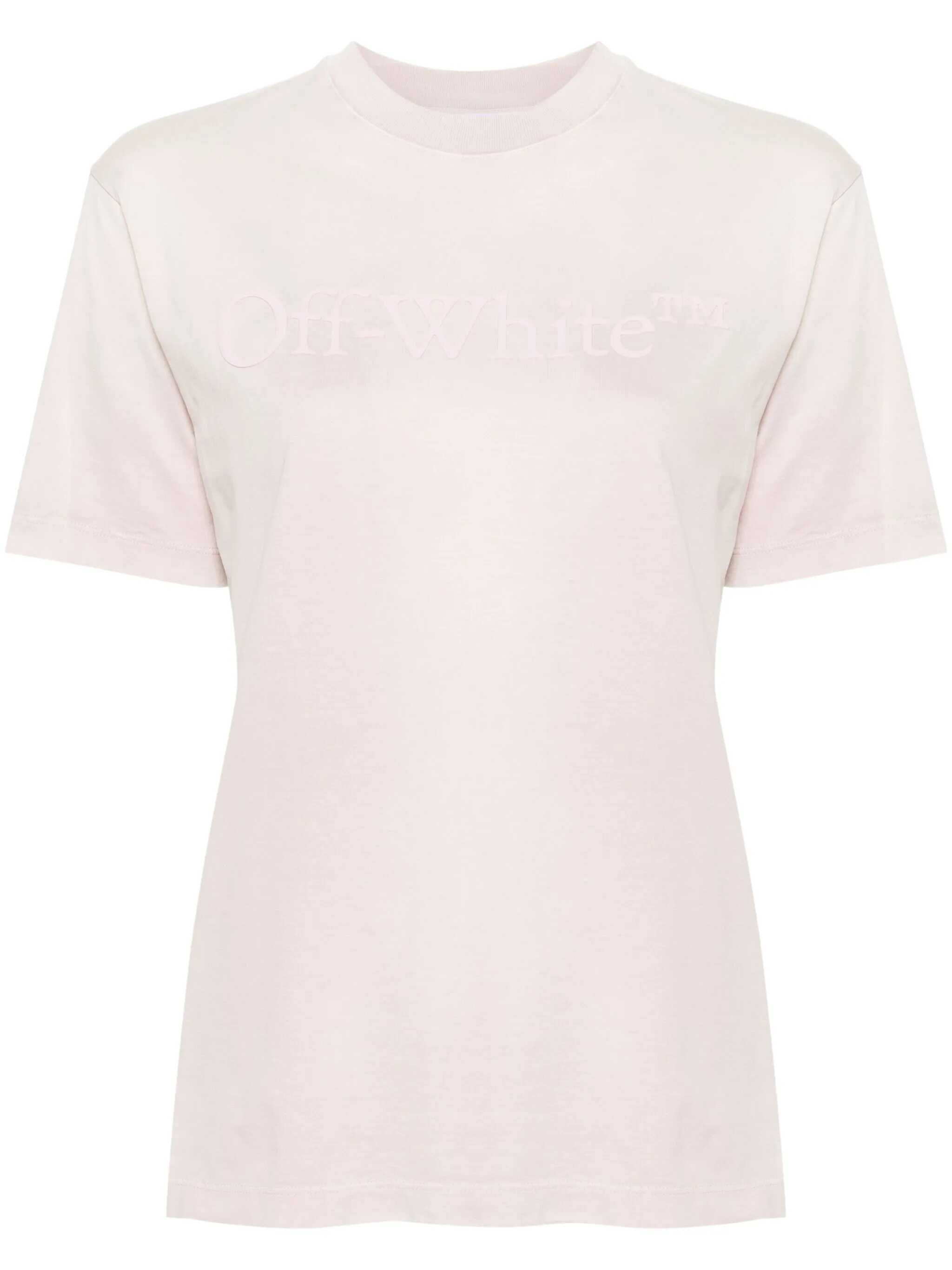 Pink T-shirt. Short sleeves. Crew neck. Off-White logo tone-on-tone on front.