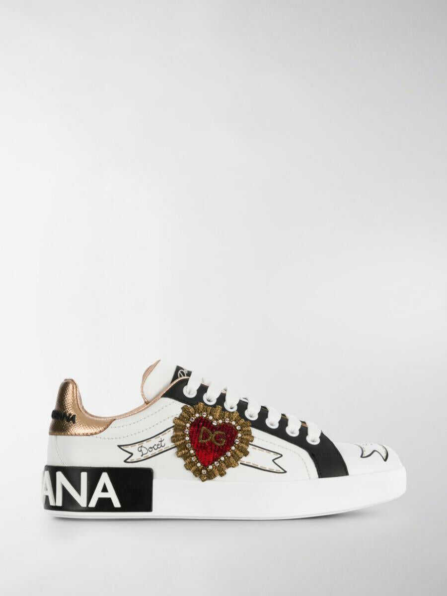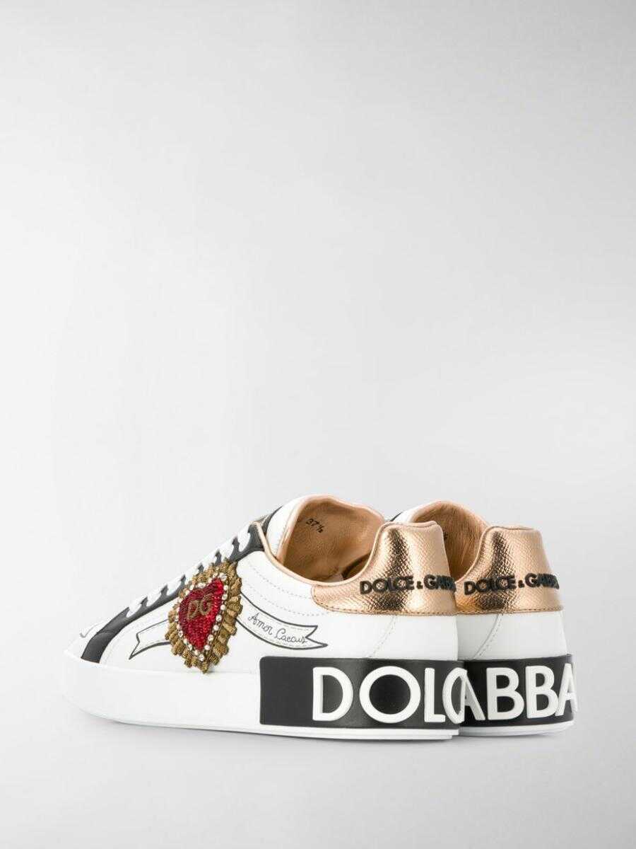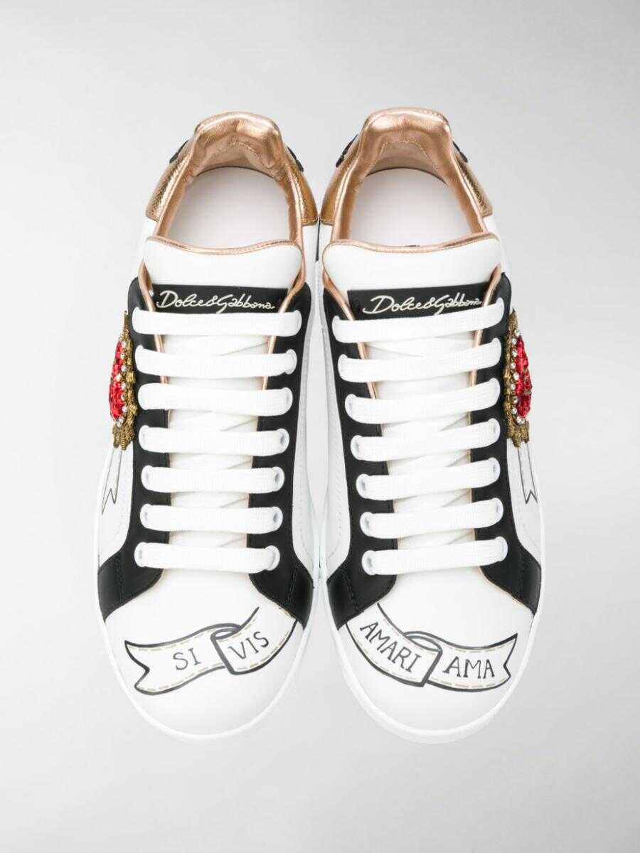 Portofino sneakers in calfskin by Dolce & Gabbana. Model with round toe, lace-up closure, logo application on the tongue, insole with logo, contrasting heel, decorations with synthetic diamonds, logo printed on the back and flat rubber sole.