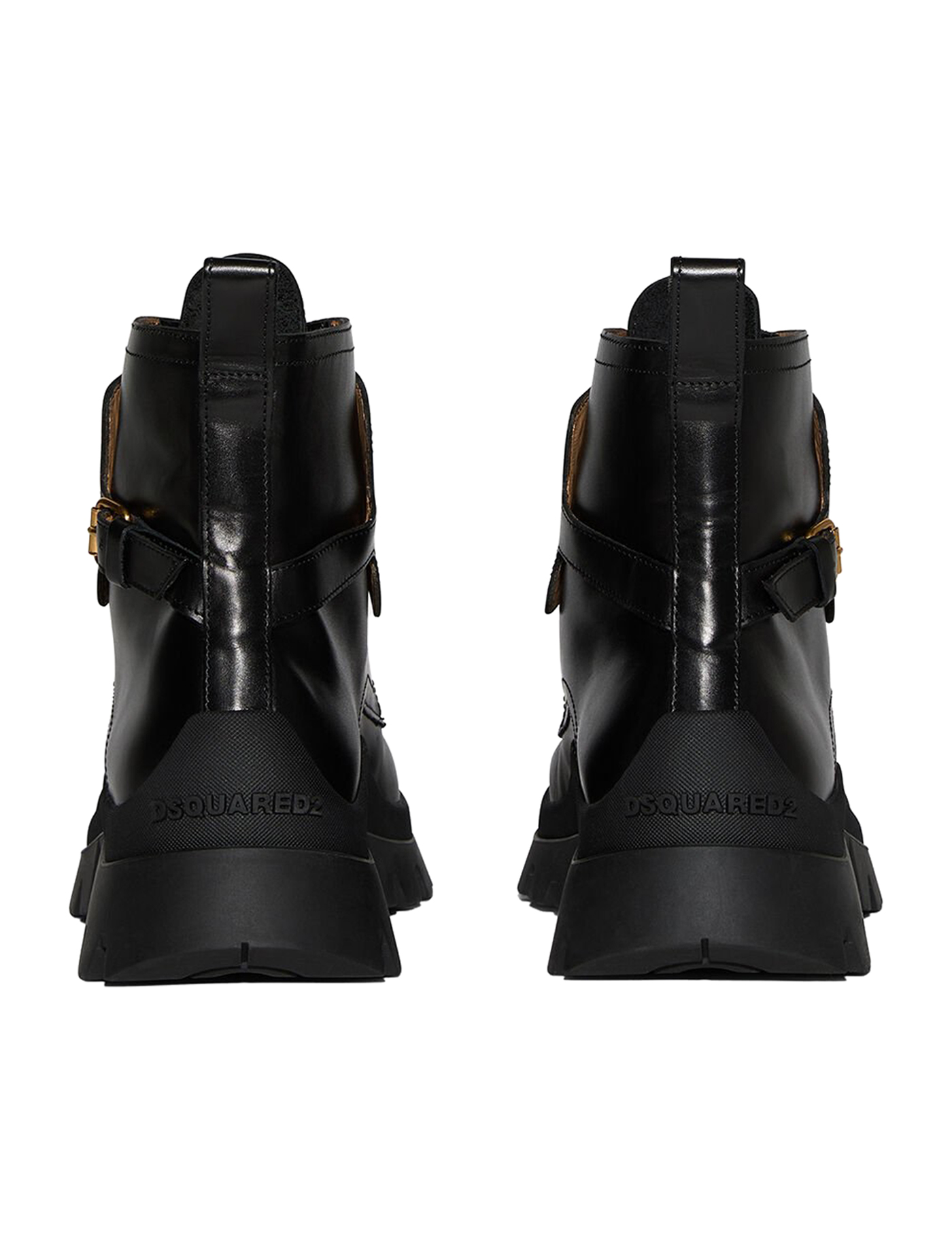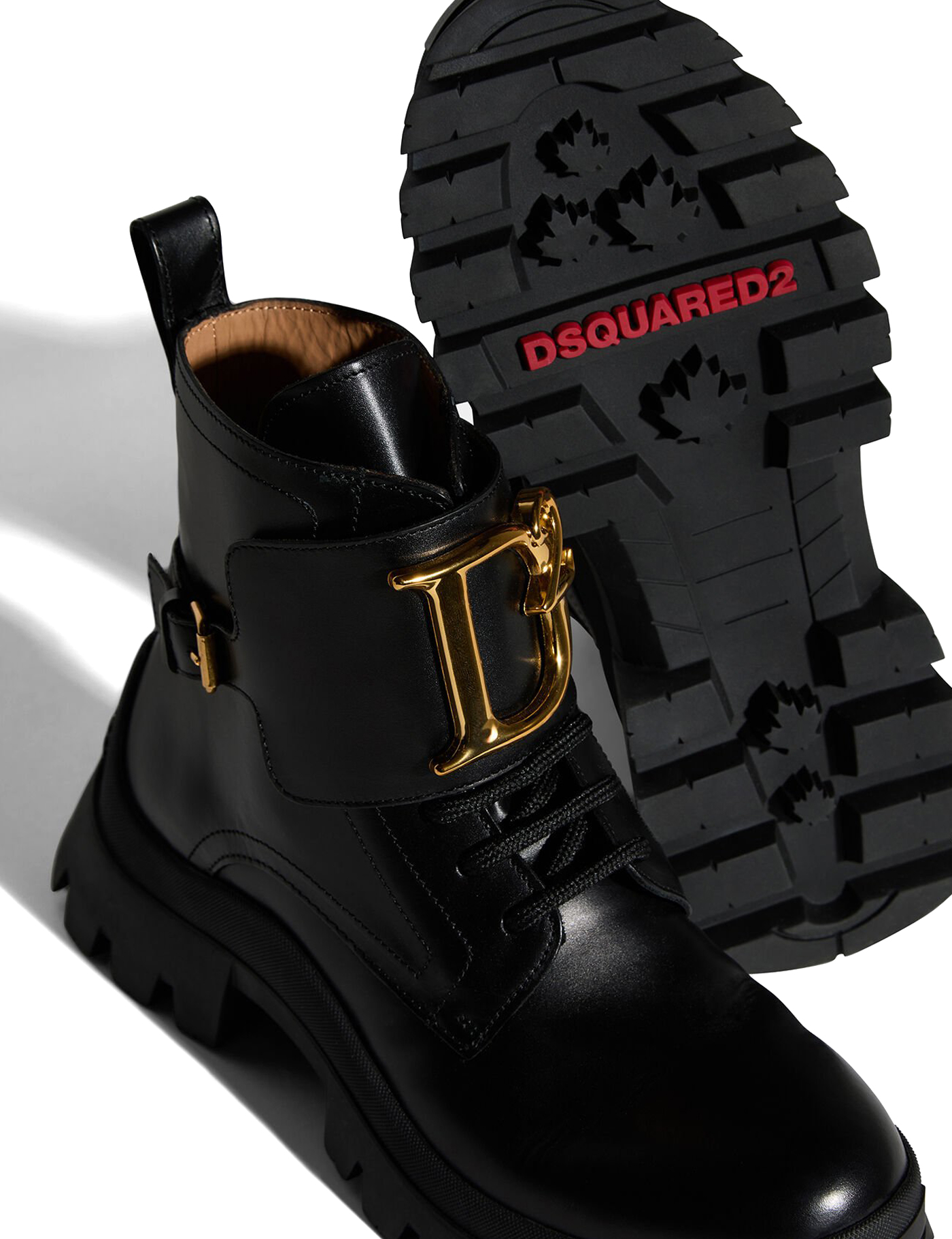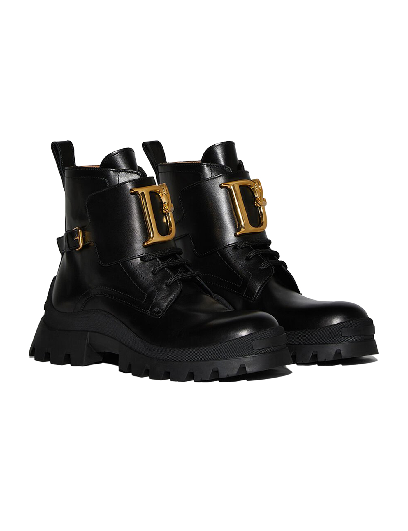 D2 Statement Dsquared2 black leather combat boot. Closure with laces and brass buckle with logo. Tongue on the back and black rubber treated sole, height 3 cm.