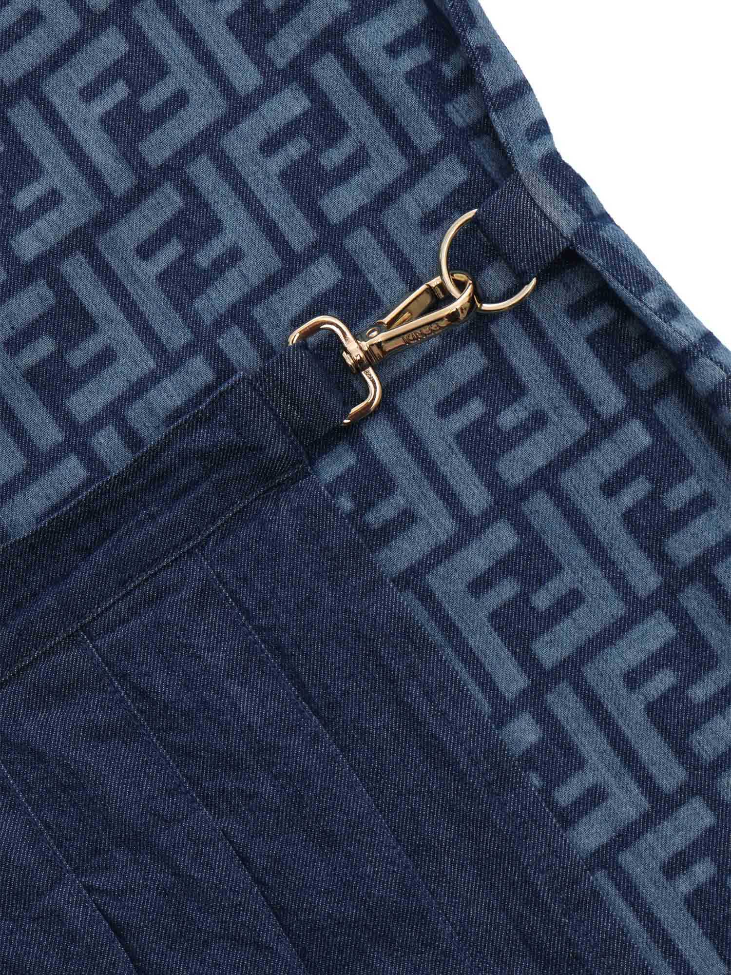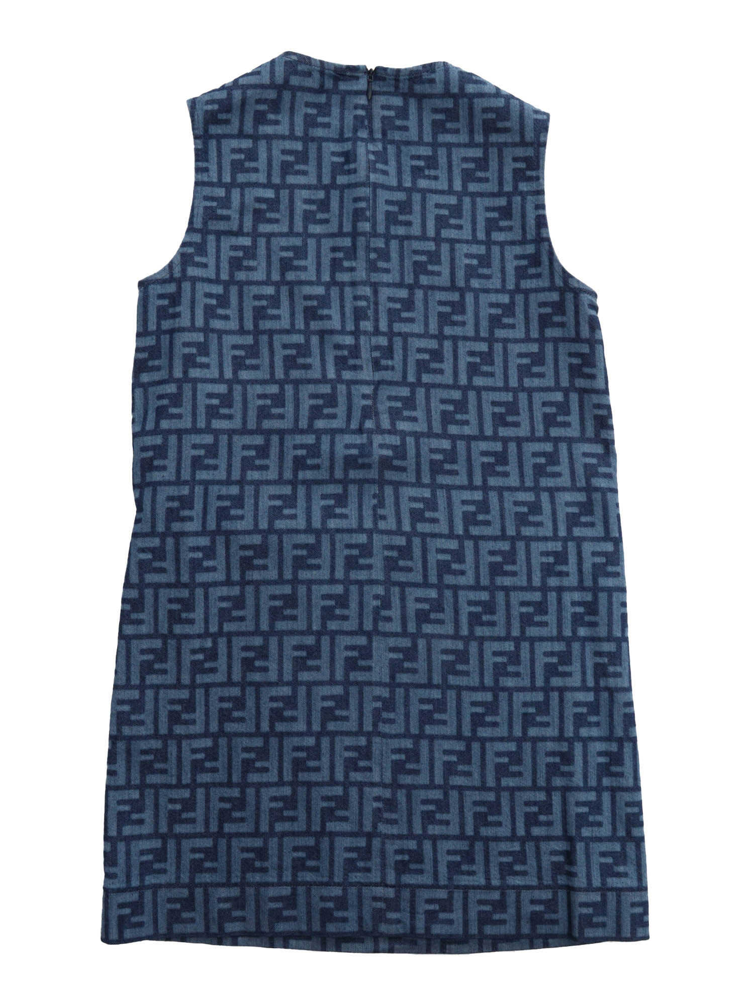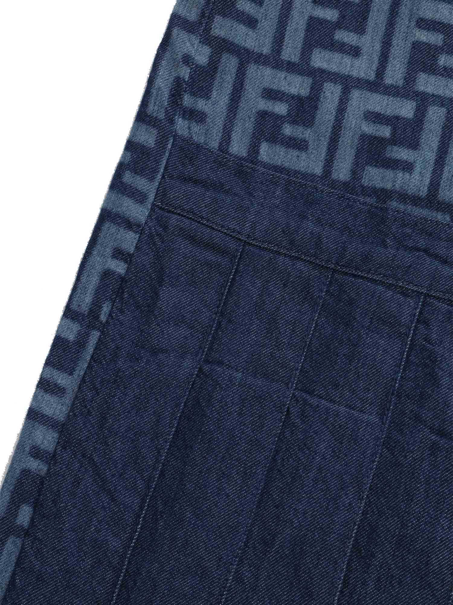 Fendi girls' denim dress with all-over FF lettering logo, added contrasting pleated fabric on the front with carabiner, rear zip.