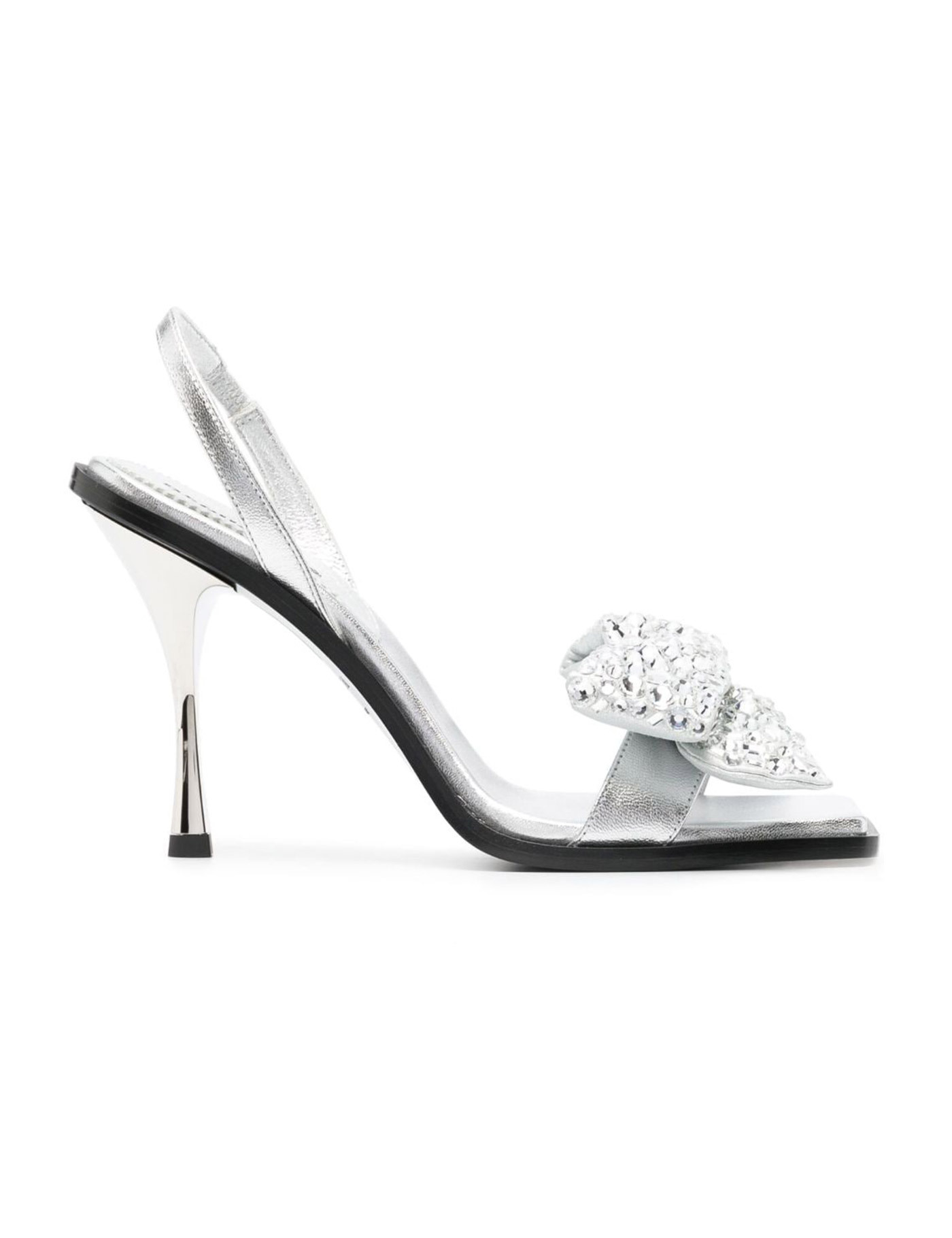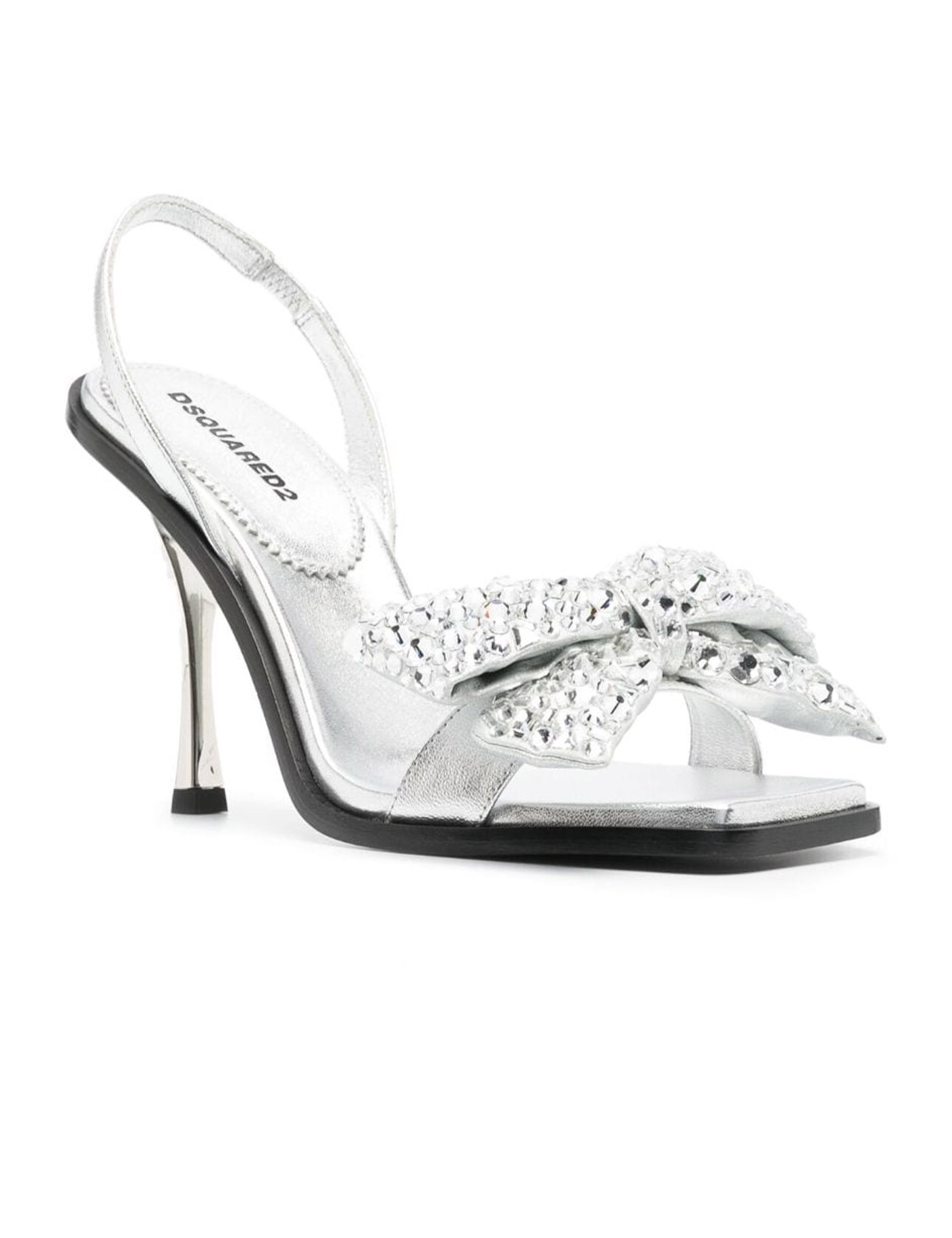 Holiday Party sandal by Dsquared2 made of silver laminated leather, featuring a square toe and a maxi bow on the front embellished with matching rhinestones. Soft leather insole and leather sole with mirror effect heel. Height 10 cm.