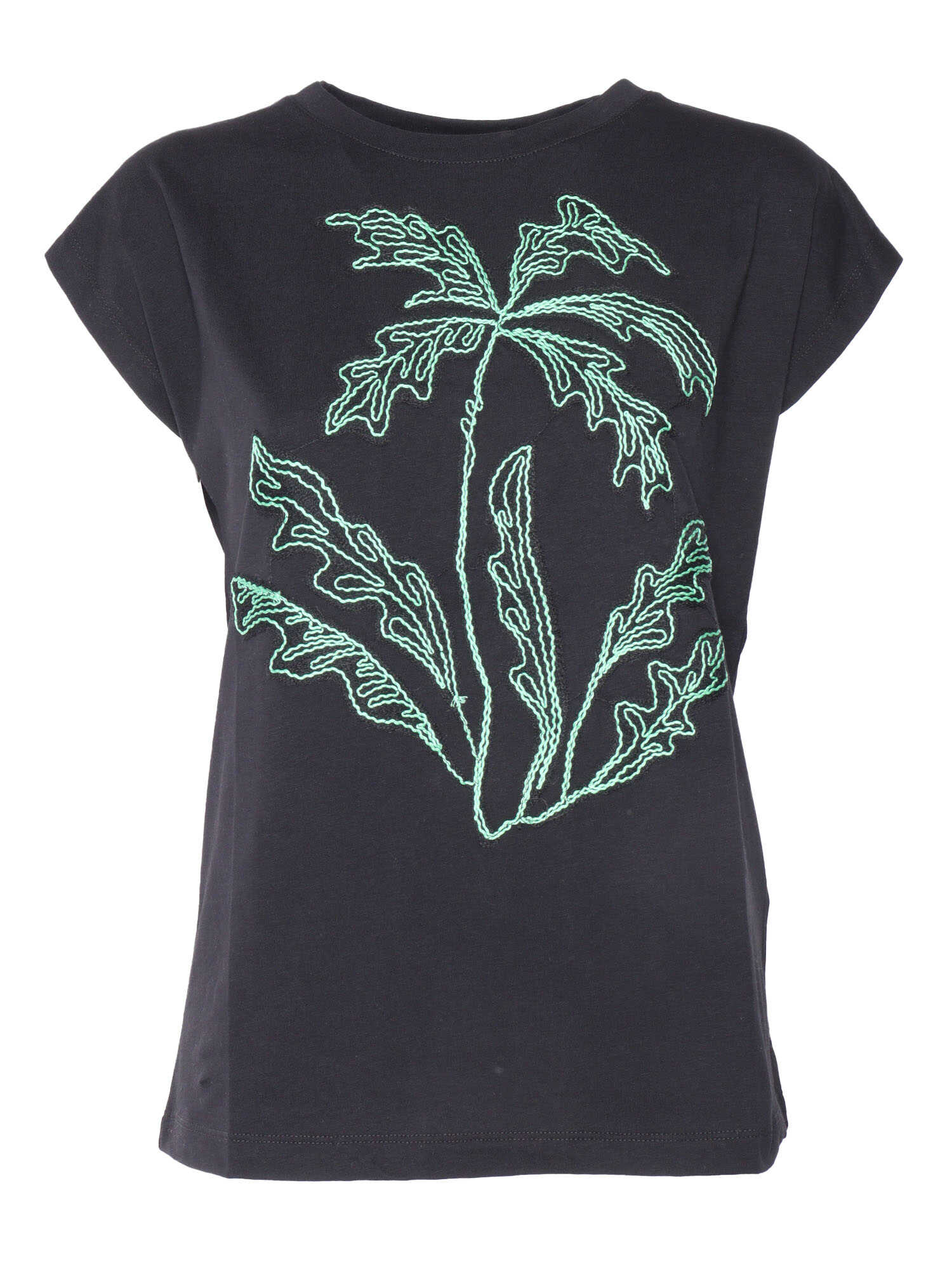 Black cotton T-shirt with short sleeves, crew neck, contrasting palm tree pattern embroidered on the front.
