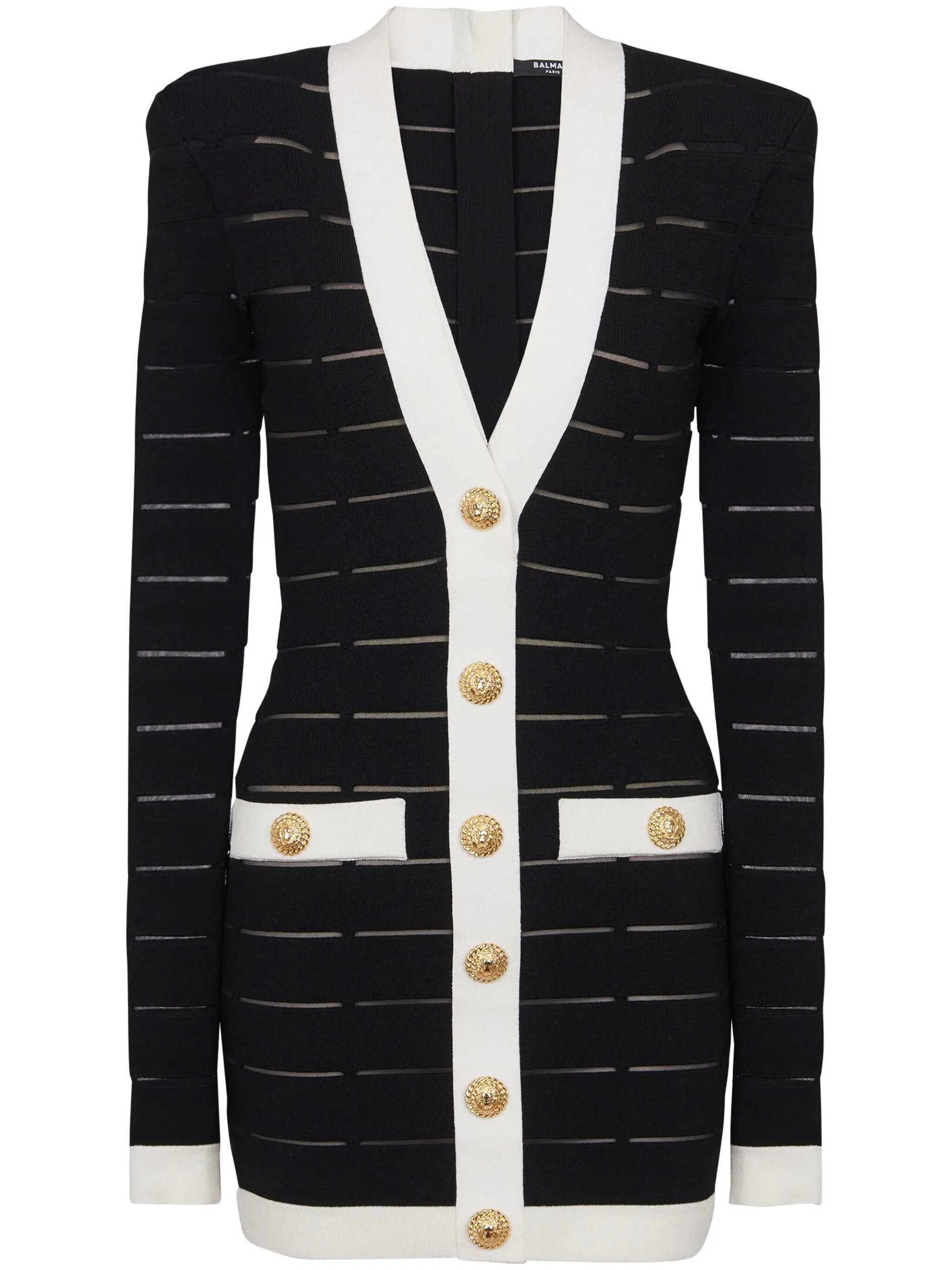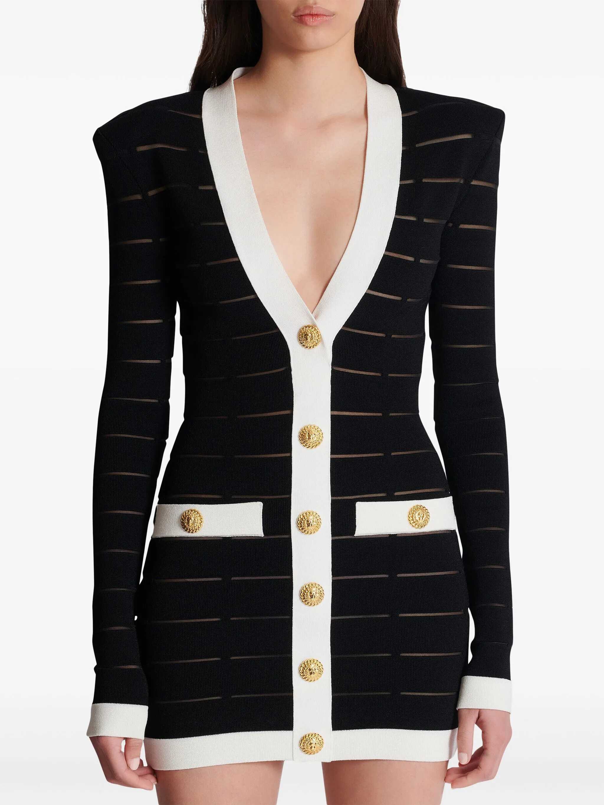 Two-tone viscose blend knit dress, sheer mesh inserts, V-neck with front logo buttons, back zip closure, padded shoulders, long sleeves