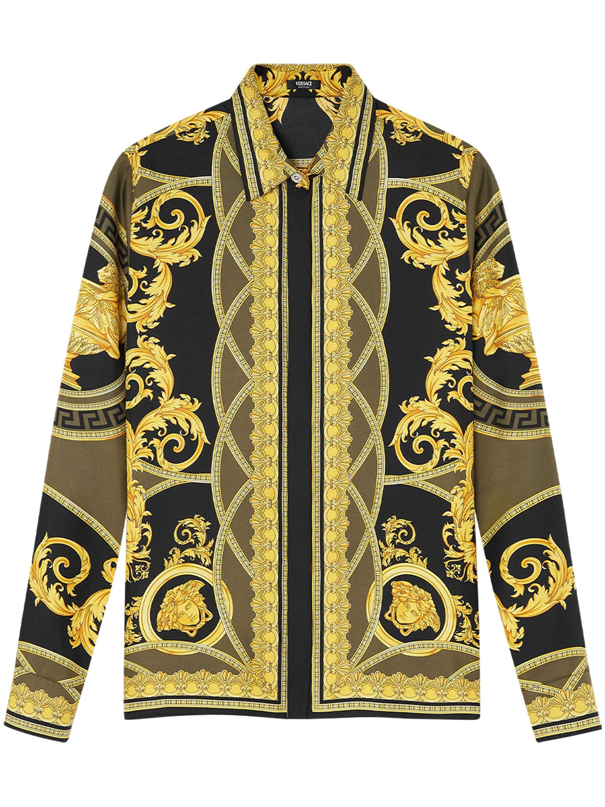 Silk long-sleeved shirt. Pointed collar. Concealed front button closure. Medusa button on front and cuffs. La Coupe des Dieux print all over.