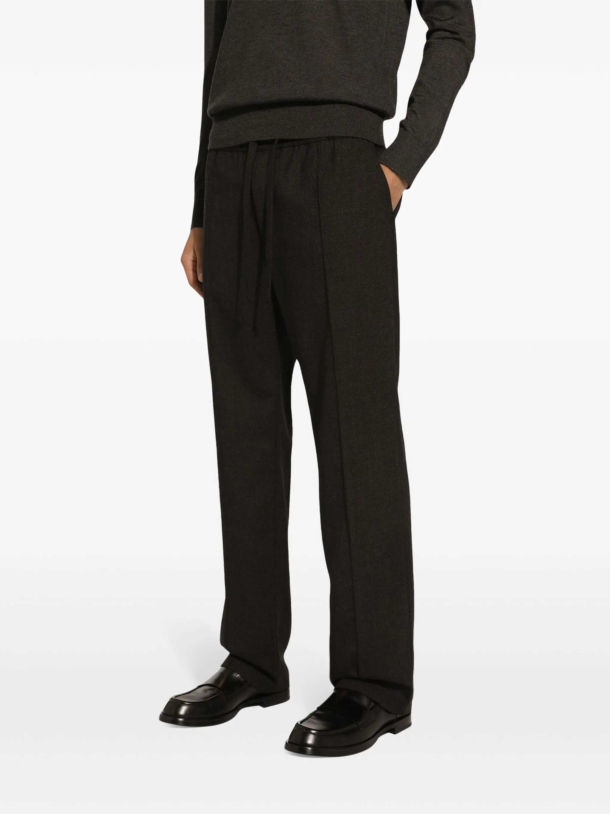Grey wool mélange effect elasticated drawstring waistband straight leg mid-rise two side slit pockets pressed crease