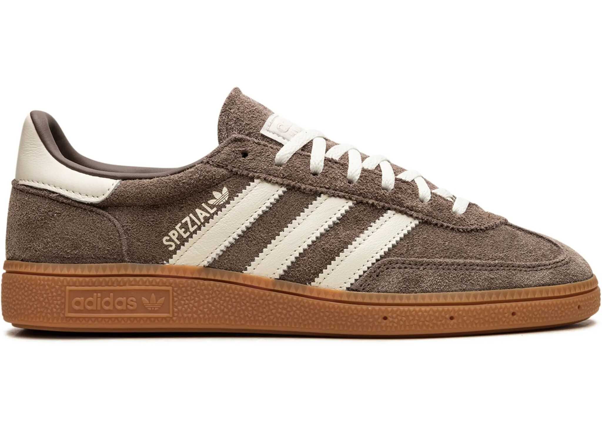 Calfskin Handball Spezial Sneakers by Adidas featuring an elongated toe, a lace-up front closure, a suede leather design, the brand's iconic oblique bands applied in contrast on the side panels, a press-stamped sneaker pattern on the outer panel, a logo-embroidered label on the front tongue, and a flat sole.