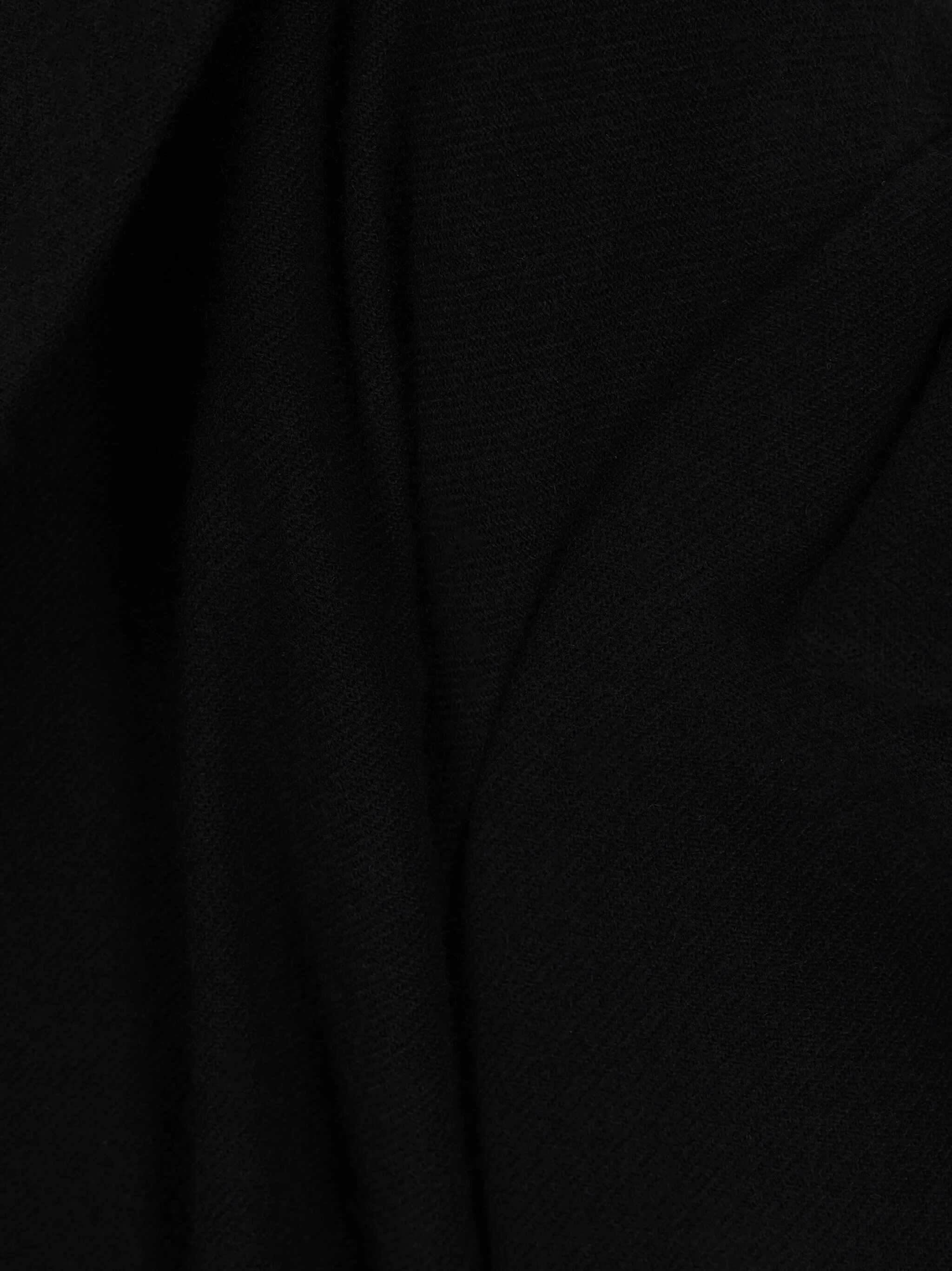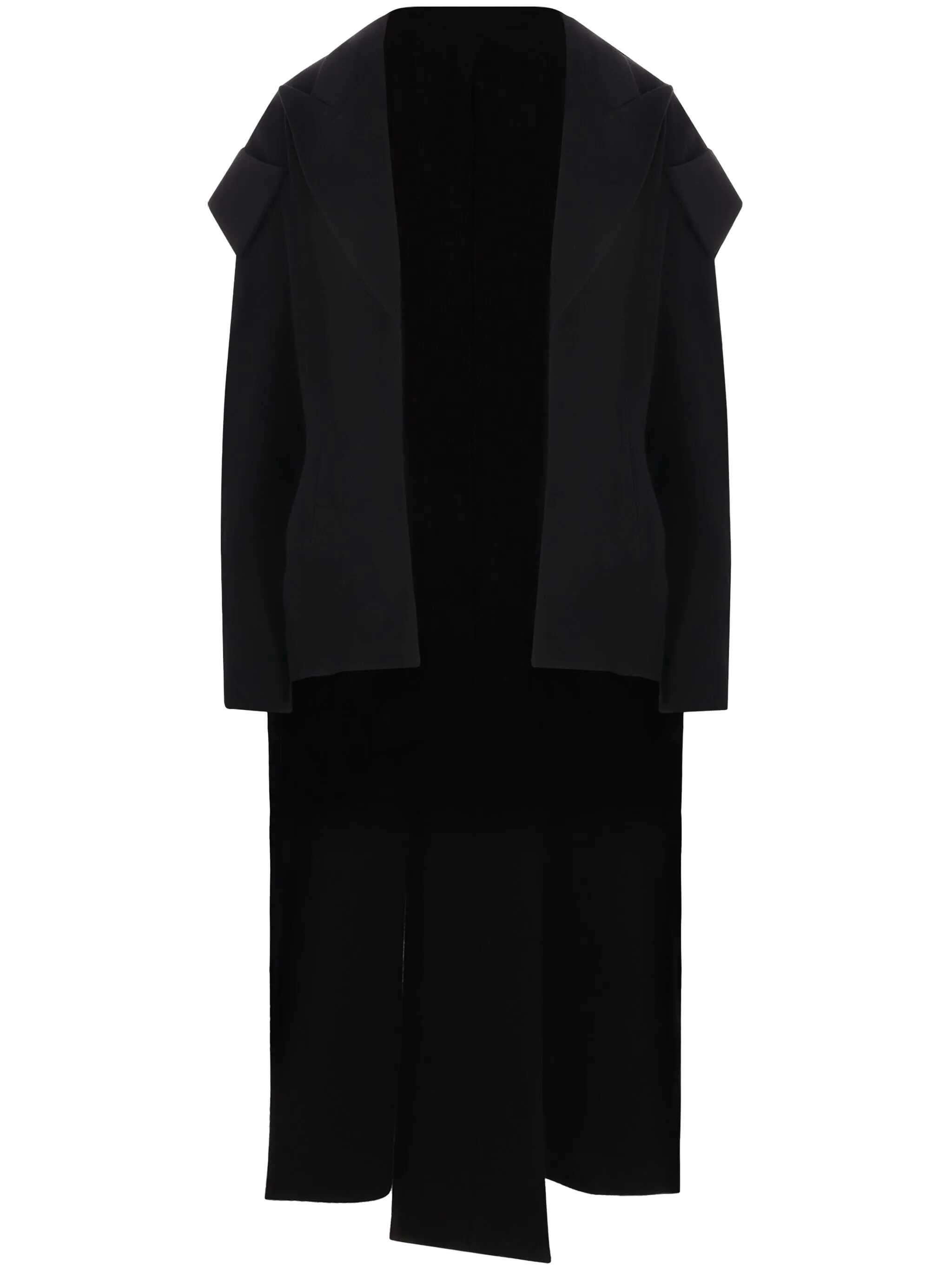 Flared jacket by Yohji Yamamoto made of black wool flannel. Features classic lapels, layered structure, long sleeves with slit cuffs and a longer back hem.