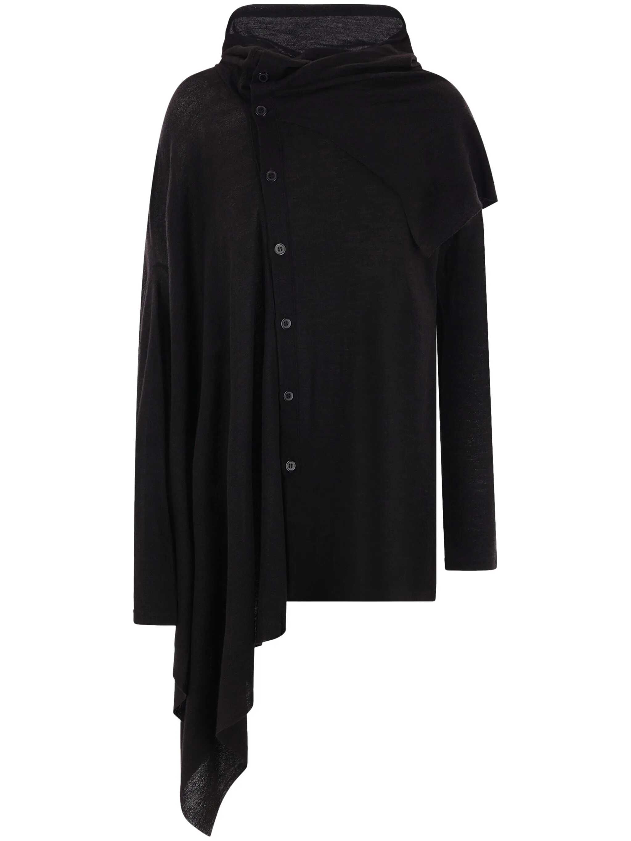 Asymmetric cardigan by Yohji Yamamoto made of black wool and silk crêpe. Features a wide neckline with a cut-out, button closure, long sleeves and a side drape.