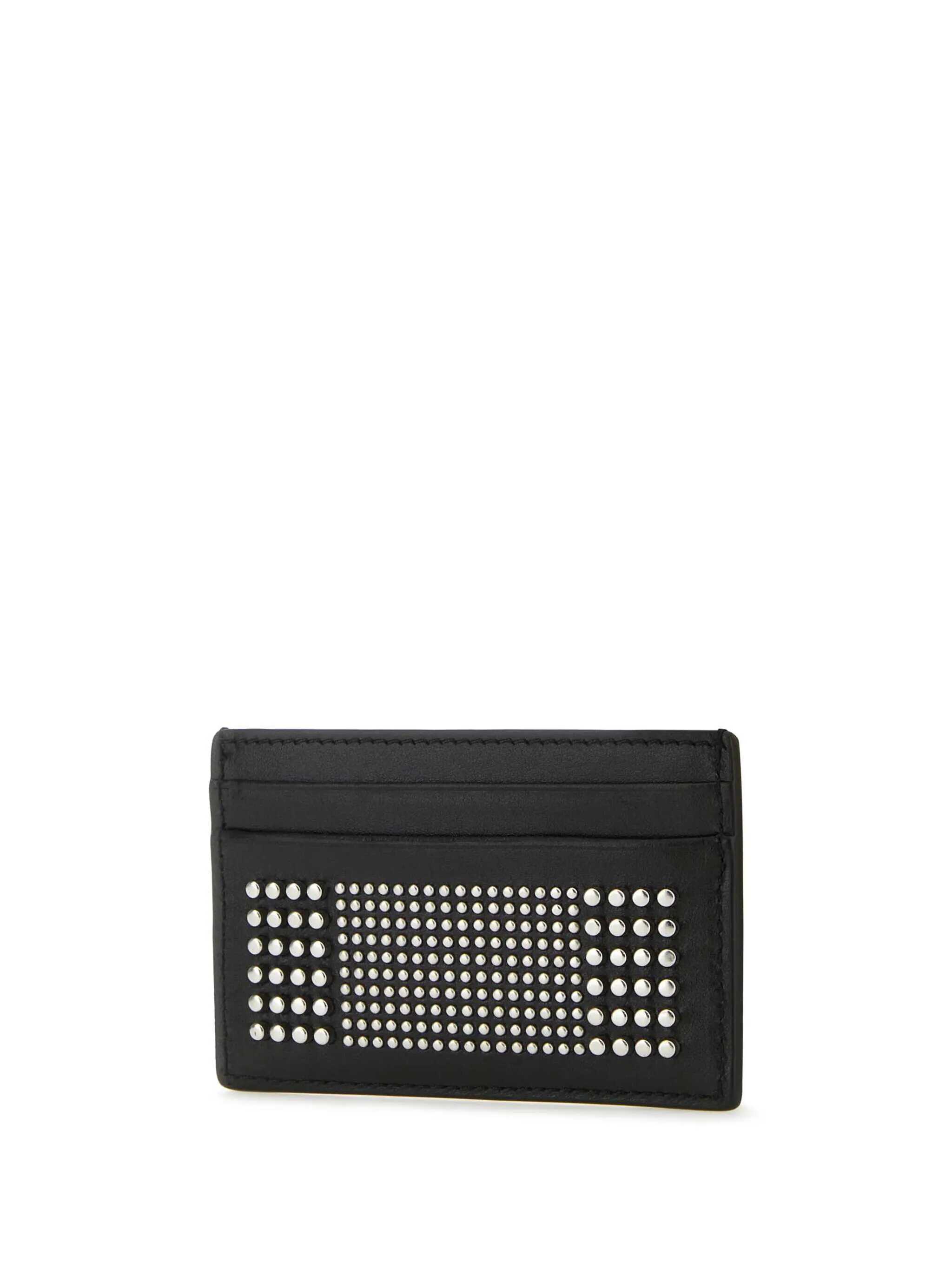 Black leather Studded card holder from Alexander McQueen featuring sivler studded details, four card slots and logo signature.