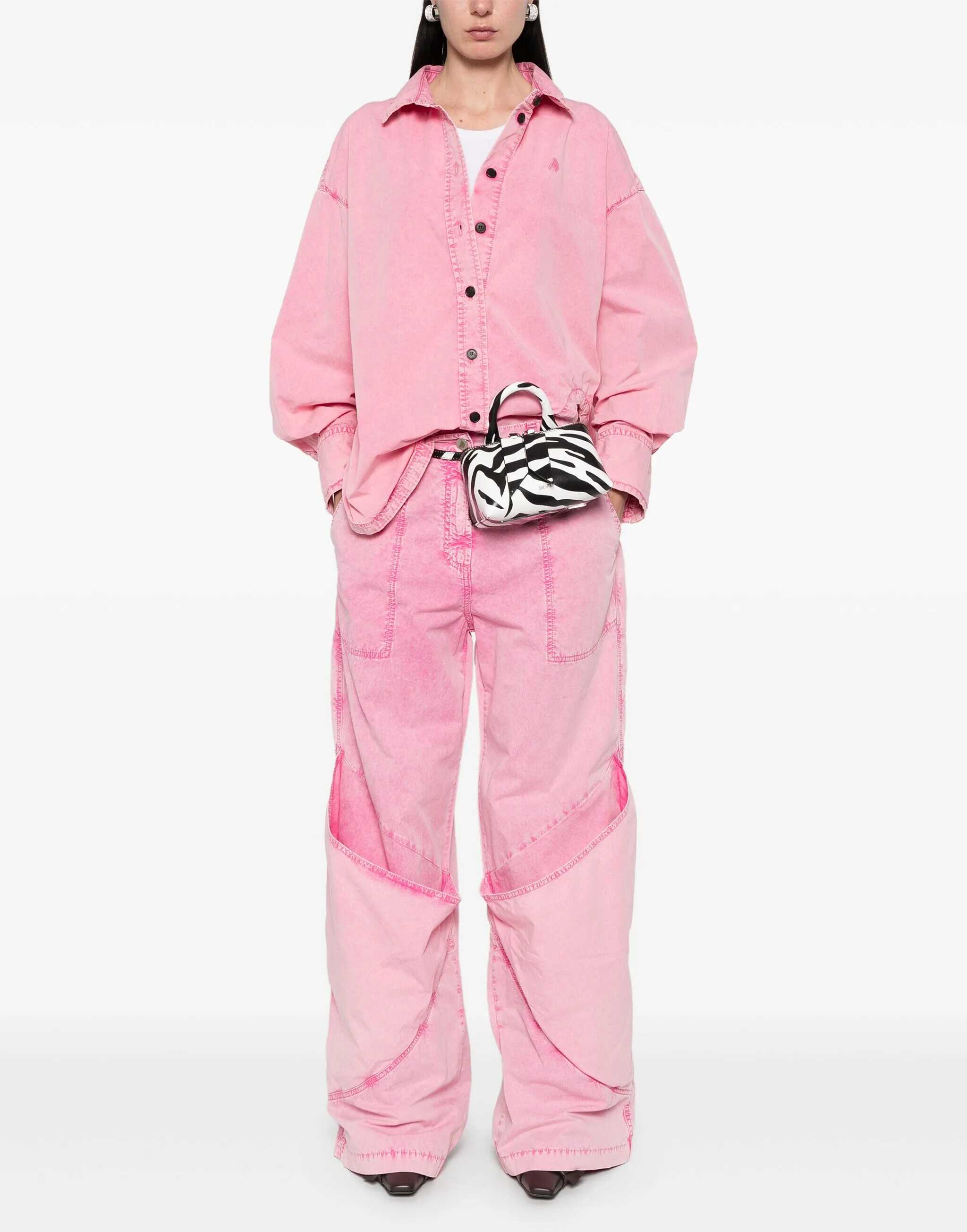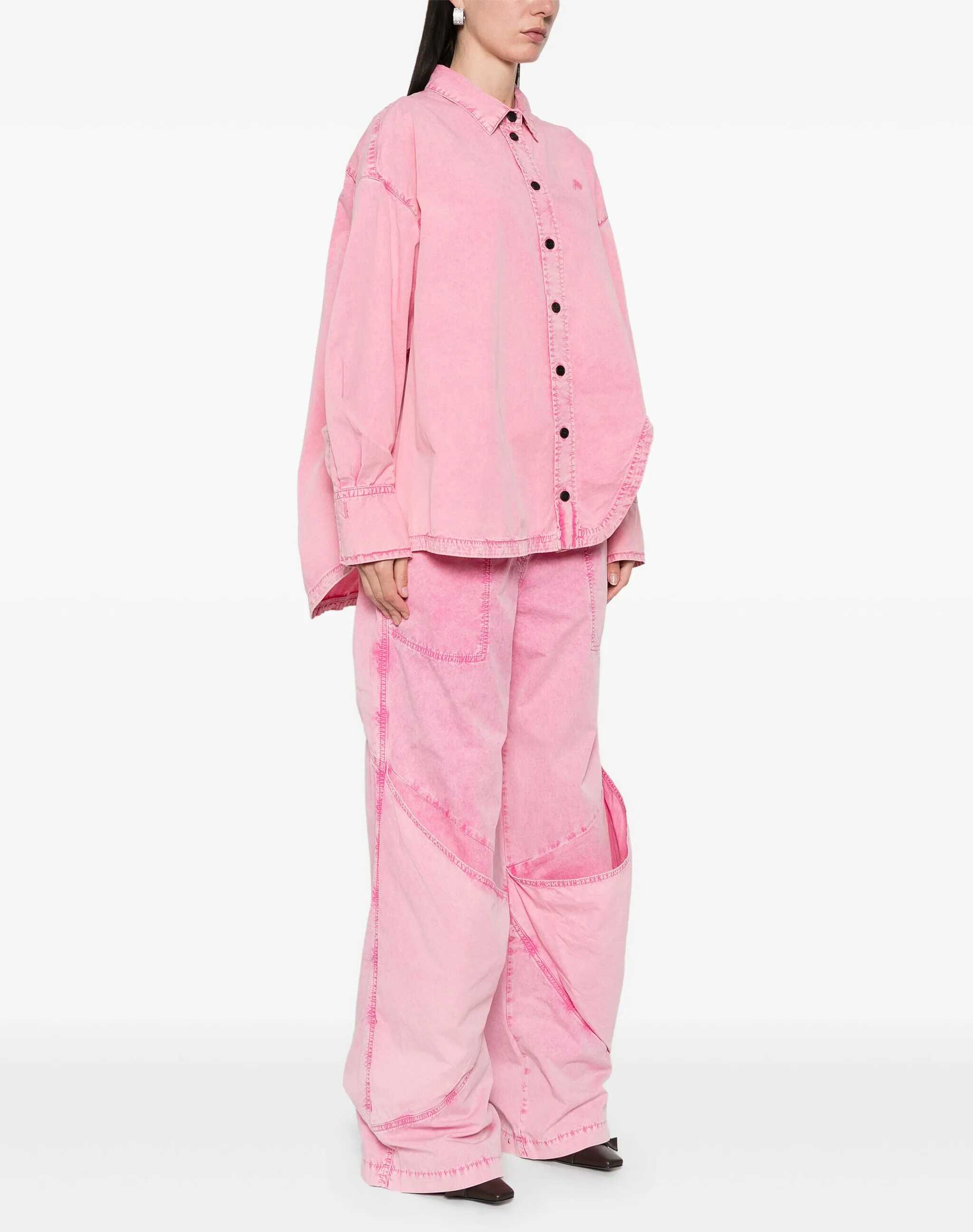 Diana shirt in cotton with a light pink wash. It features black button closure, pointed collar, shaped front slit, tonal embroidered logo on the front, cuffs with two buttons, and a longer back. Oversized fit.