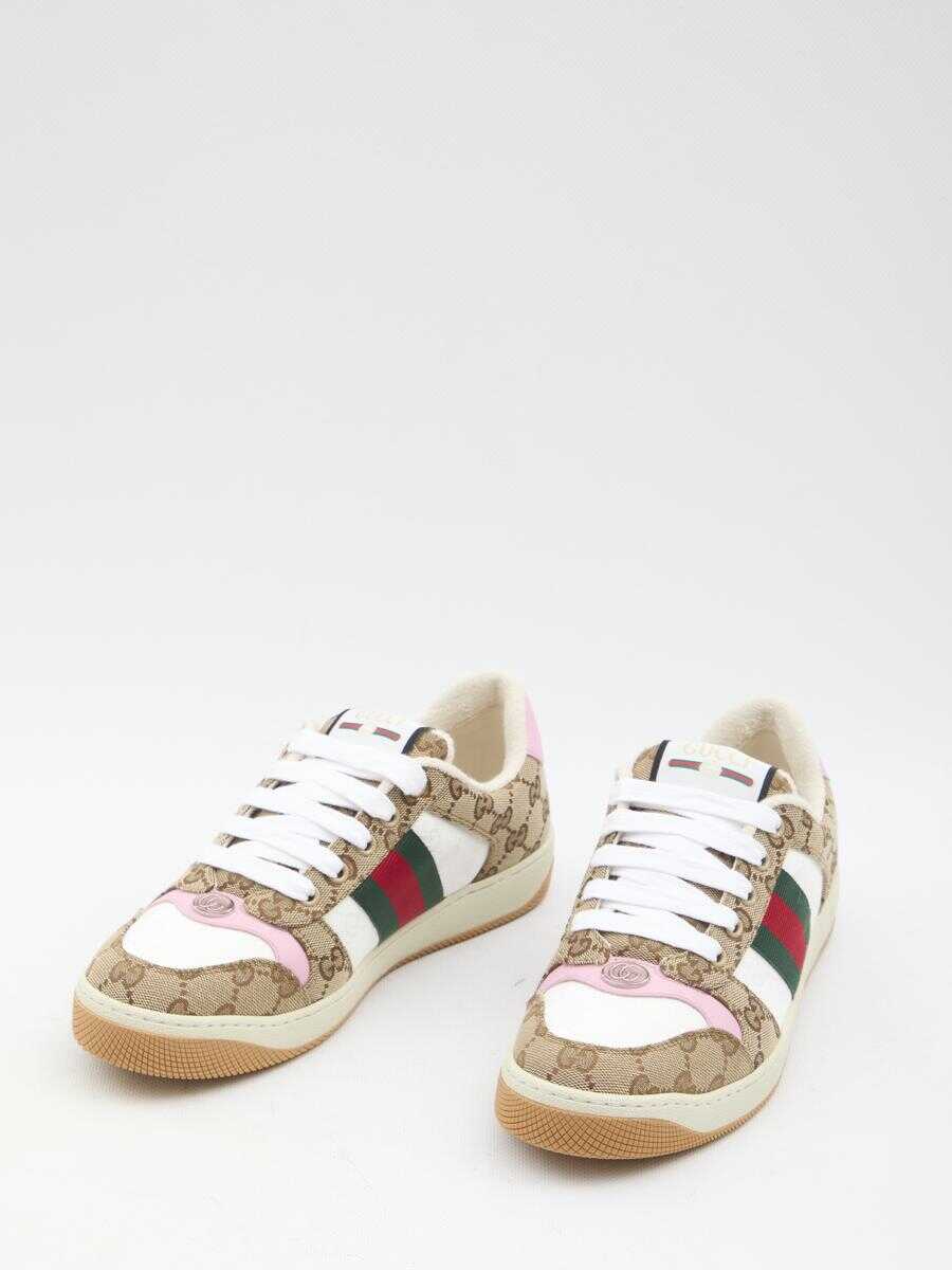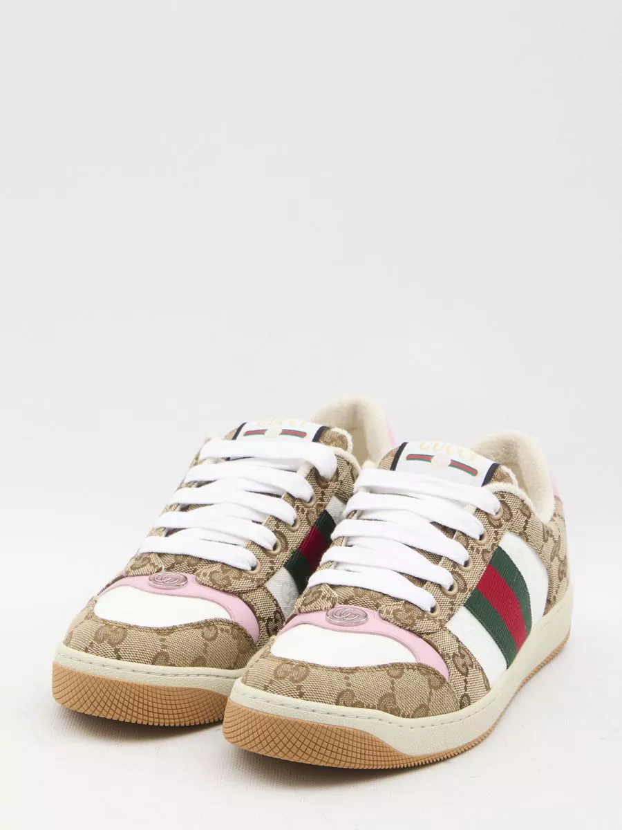 Screener sneakers in beige and dark brown Original GG canvas with red and green Web stripe on the side. They feature pink leather trim on the toe and on the back with logo, oval enameled detail with metal Double G on the toe, label with Gucci vintage logo on the tongue and rubber sole. Dust bag included. Additional laces included. Any leather imperfections are not to be considered manufacturing defects, but a peculiarity of the material.