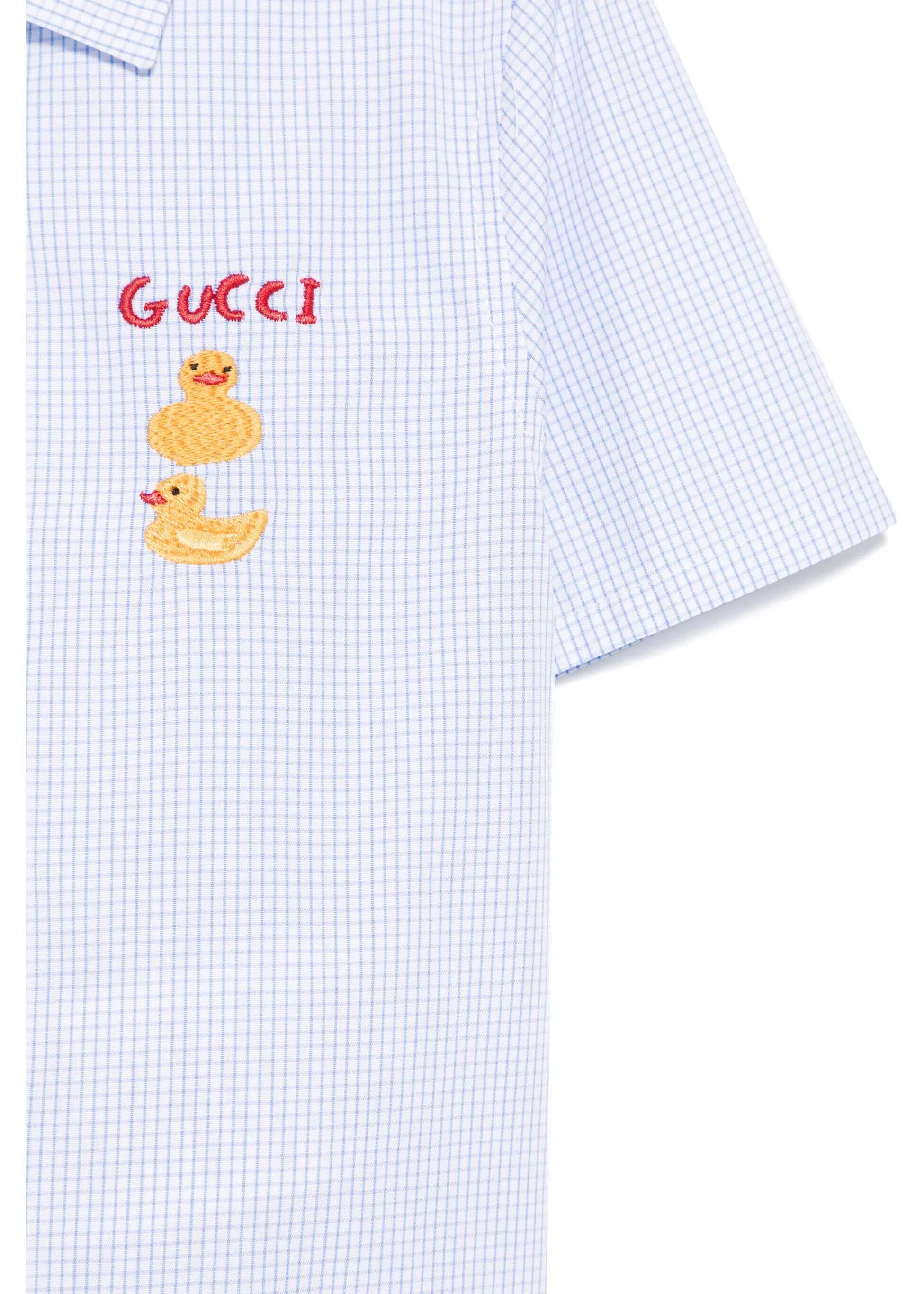 Gucci's cotton boy's Shirt is a short-sleeved design for a cool, comfortable look. It features a classic collar and a front button closure. On the front, the iconic embroidered logo, a distinctive symbol of the brand, stands out. A stylish and versatile garment, perfect for a casual-chic look for the little ones.