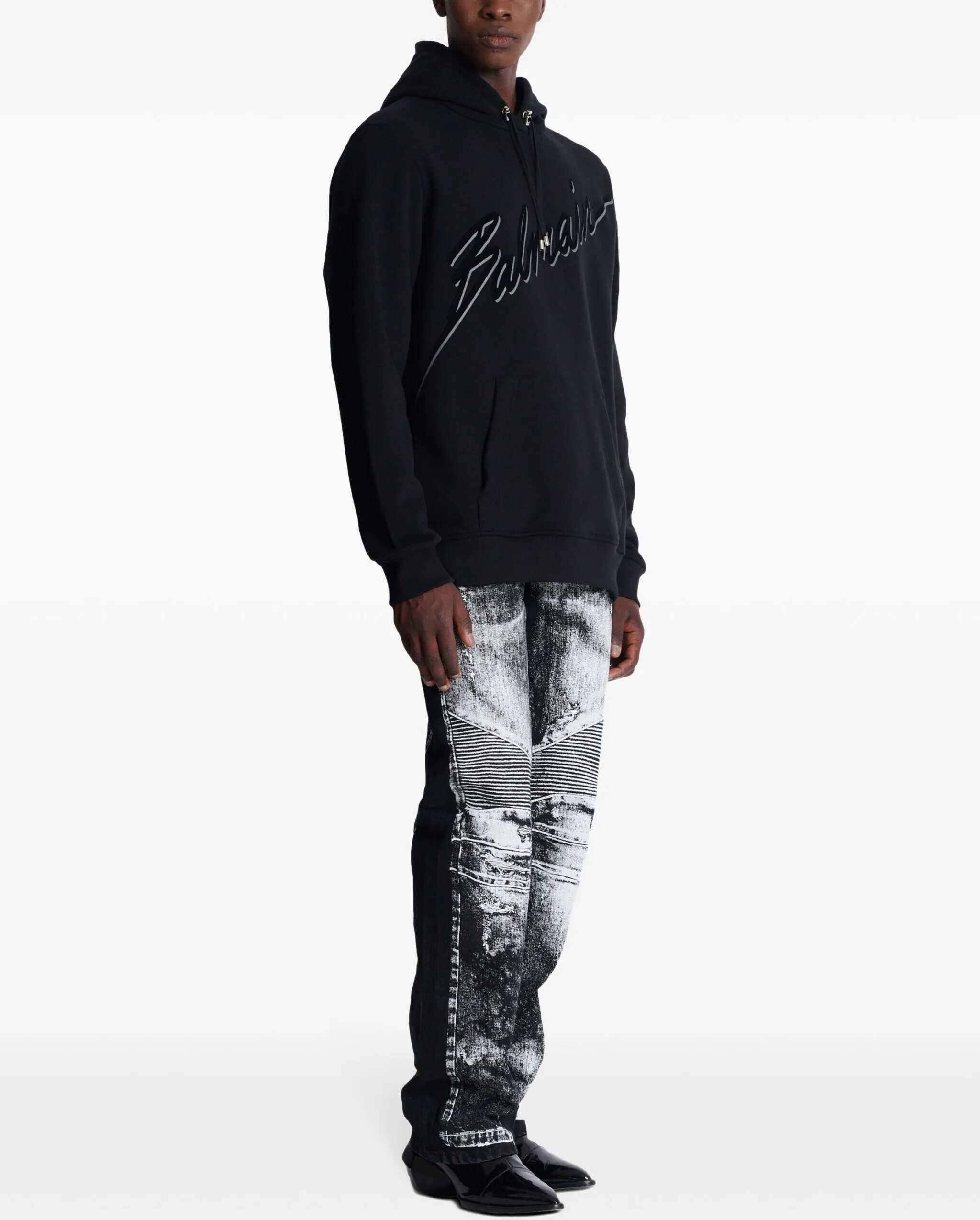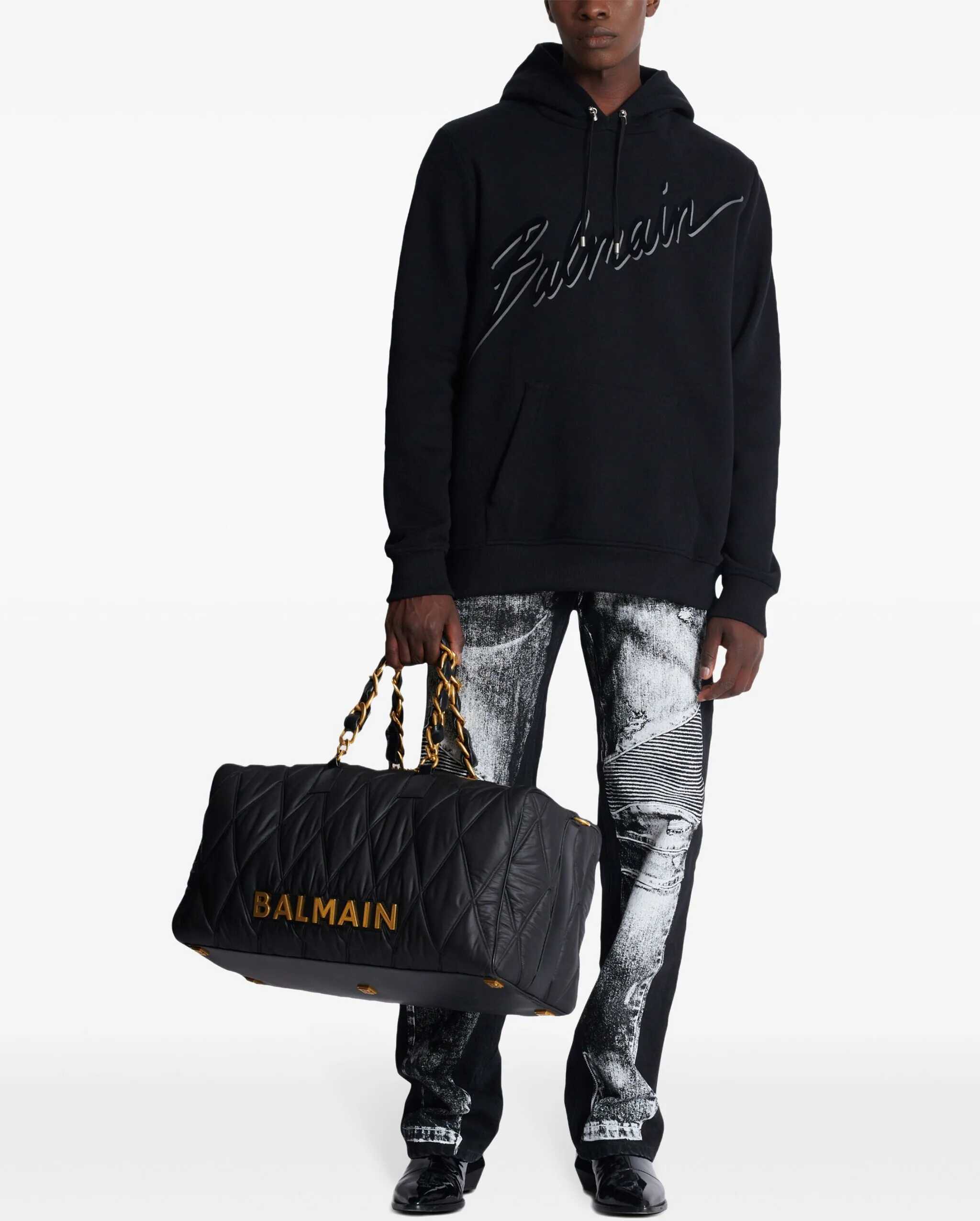 Balmain's cotton hoodie is a casual and refined piece of clothing. It features an adjustable drawstring hood and a pouch pocket on the front for practicality. Ribbed hems and cuffs ensure a comfortable fit. The brand's iconic logo, printed on the front, adds a distinctive touch. A versatile garment perfect for a high-class streetwear look.
