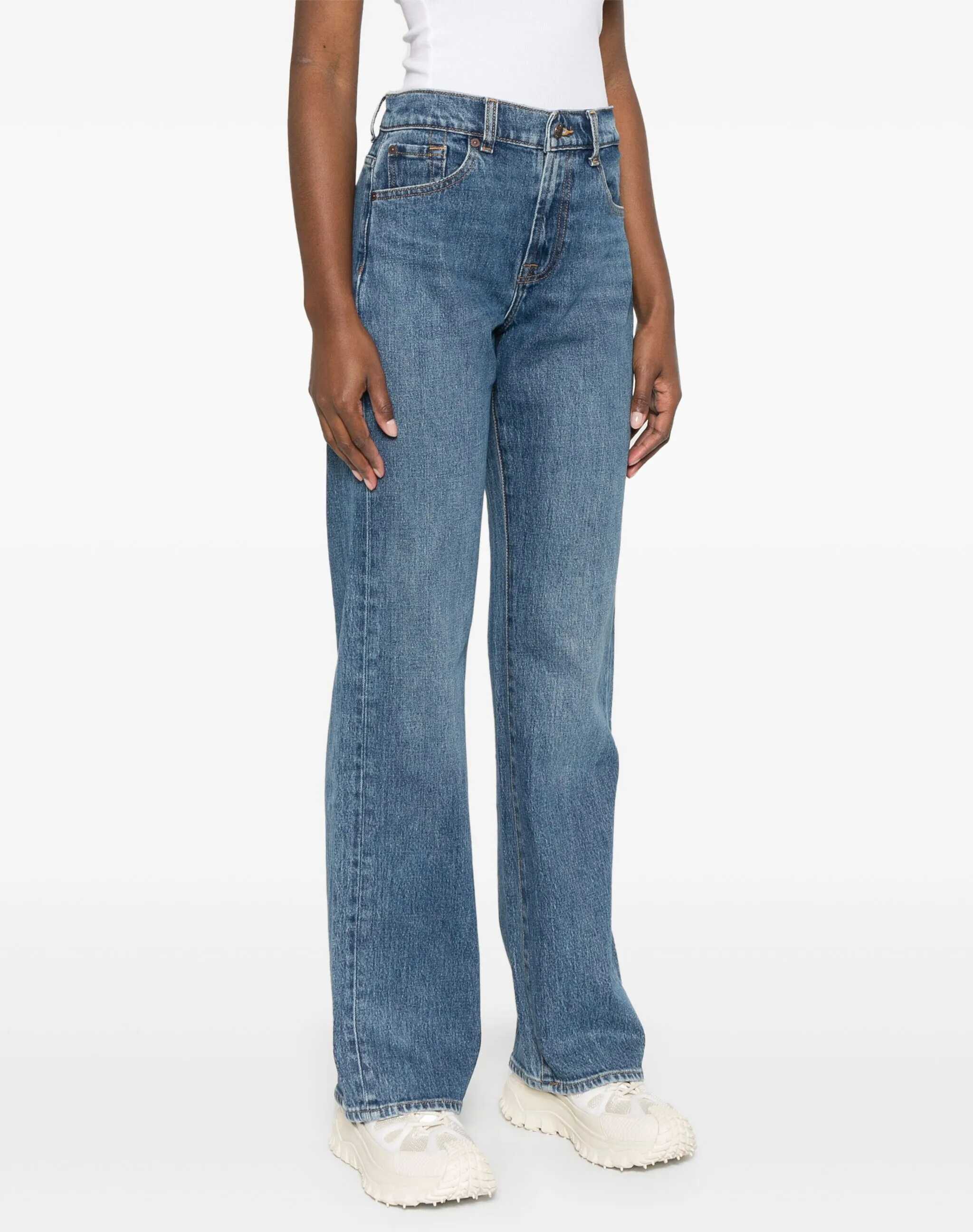 7For's cotton Jasper Jeans have a straight five-pocket design and a front button-and-zip closure. They feature belt loops on the waistband and are embellished with the brand's iconic pressure-printed leather signature patch applied to the back.