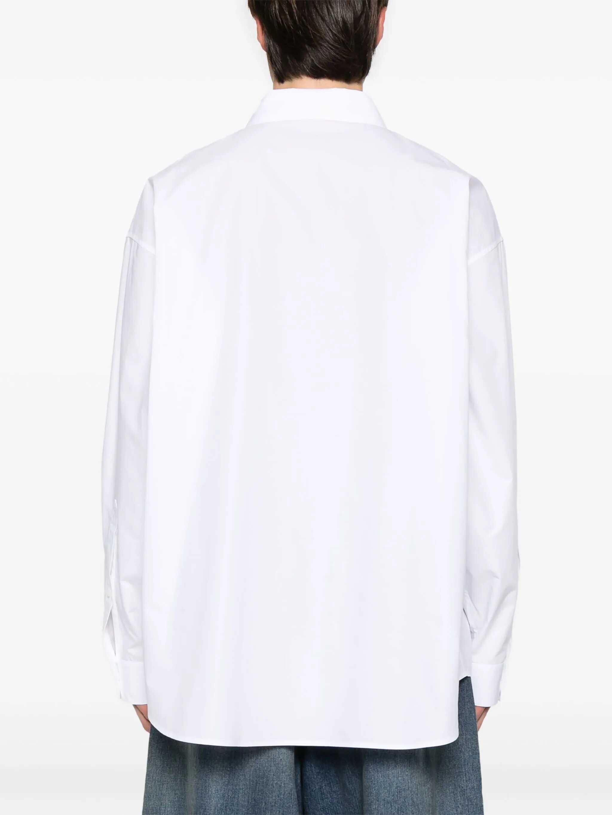 Balenciaga's Minimal Cotton Shirt features a classic collar with an elegant tone-on-tone embroidered monogram. The front closure features buttons, while adjustable button cuffs add a touch of practicality and style. With a monochrome pattern and an oversized fit, this shirt combines understated elegance with a modern design, perfect for a sophisticated, contemporary look.