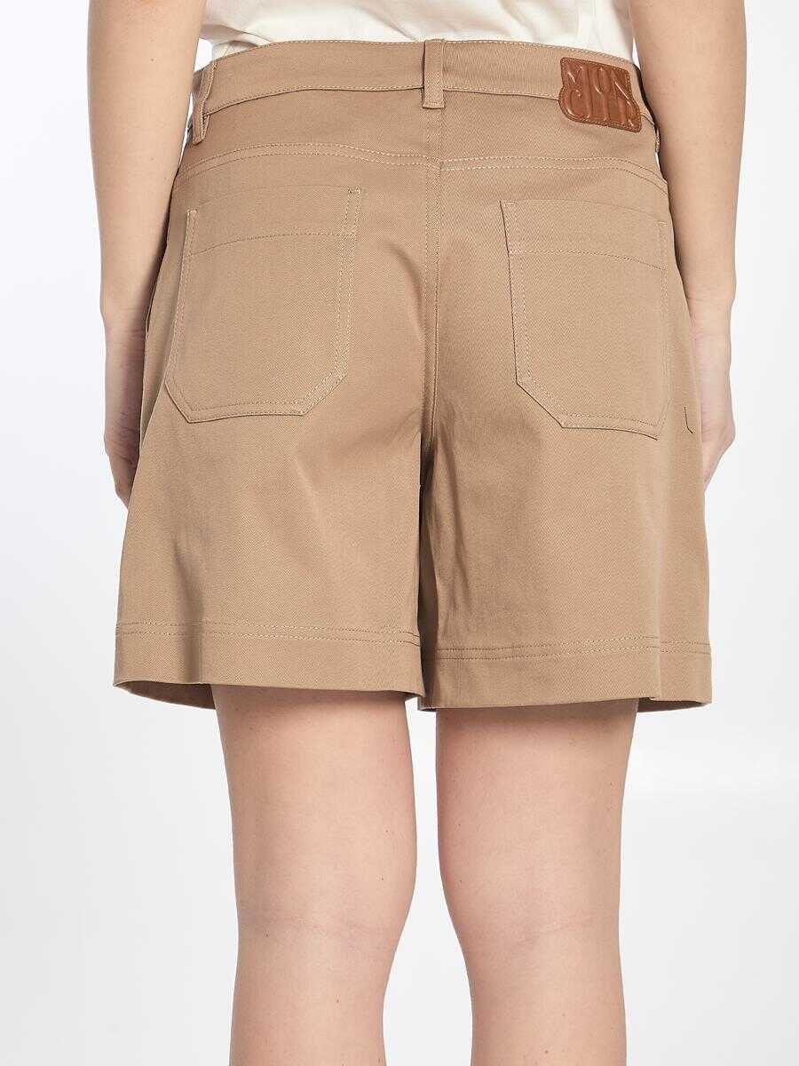 Shorts in beige gabardine cotton. They feature zip and button closure, two side pockets, two back pockets and brown logo patch on the back.