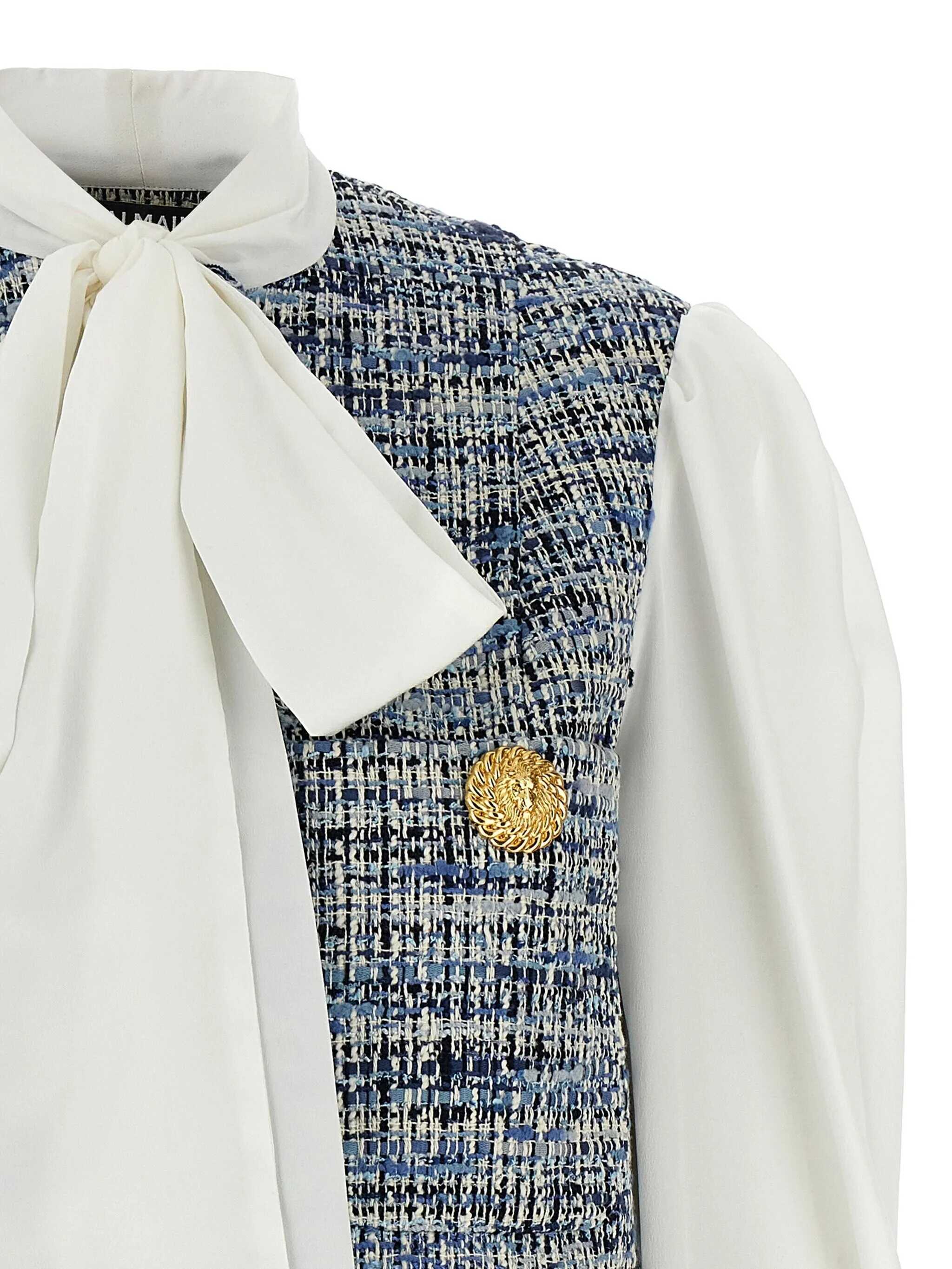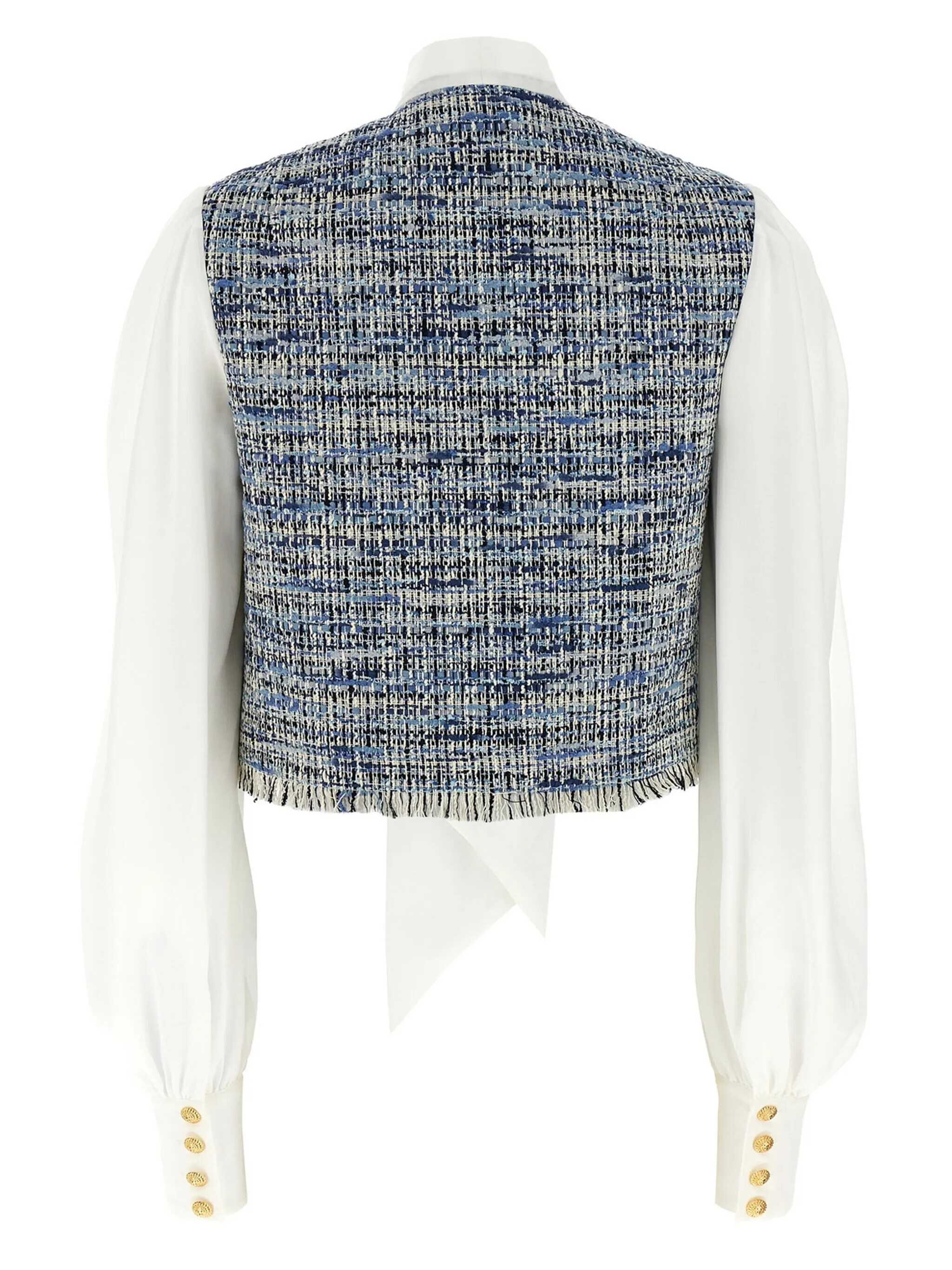 Crepe de chine shirt with tweed vest, levallière sleeves and collar, cropped style with fringes on the hem, 'Chiocciola' button closure, pockets, long cuffed sleeves