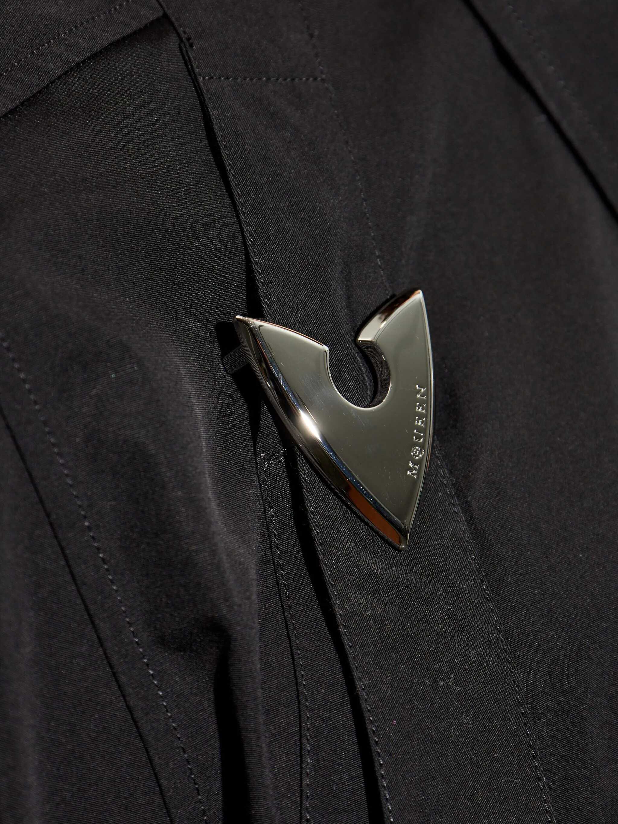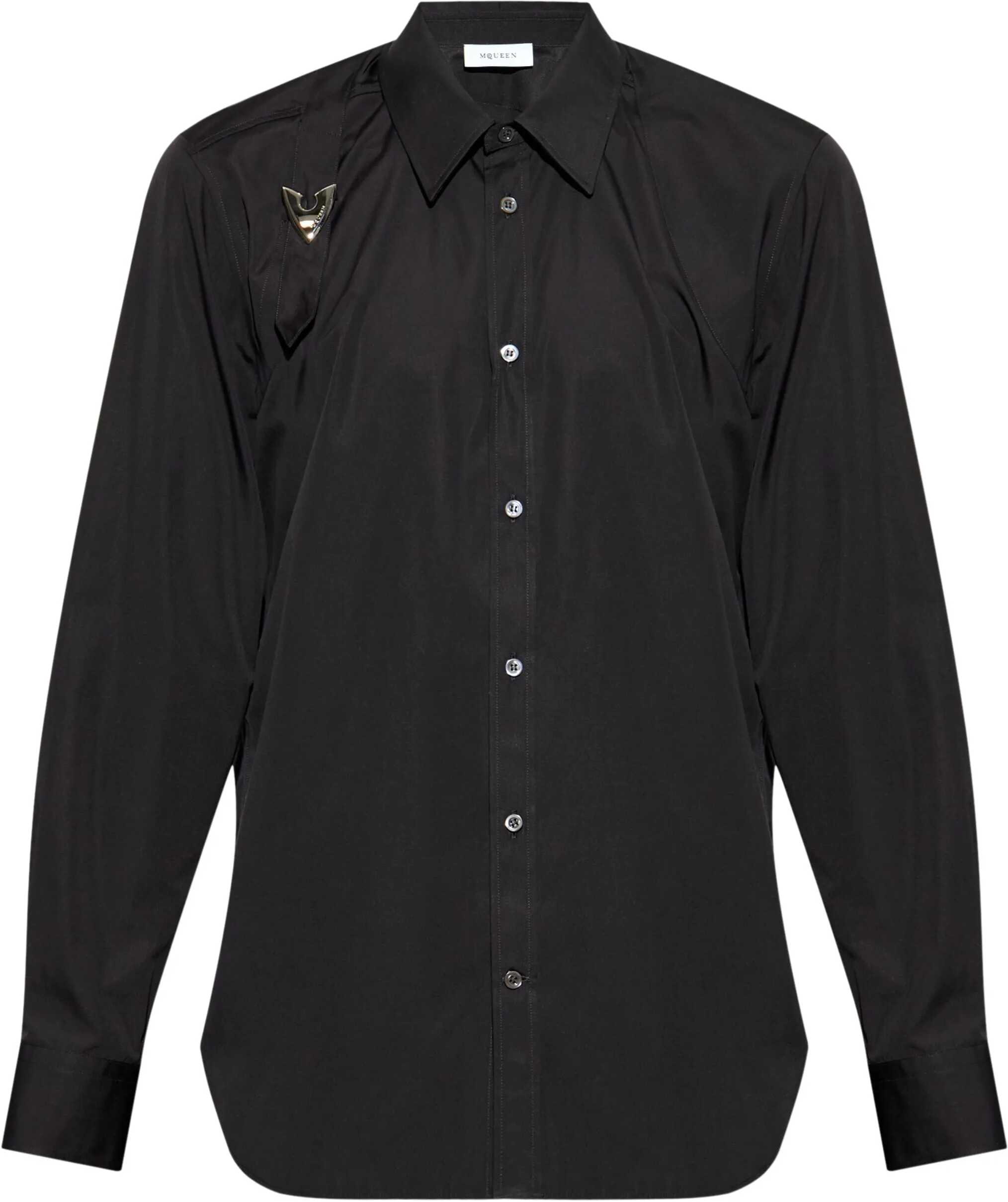 Alexander McQueen's Buckle Shirt is a distinctive and bold piece of clothing, featuring a classic collar and logoed strap detail on the front, accentuating its modern and iconic design. The front button closure and adjustable button cuffs add functionality without sacrificing style. A garment that combines elegance and a touch of originality, typical of the brand.
