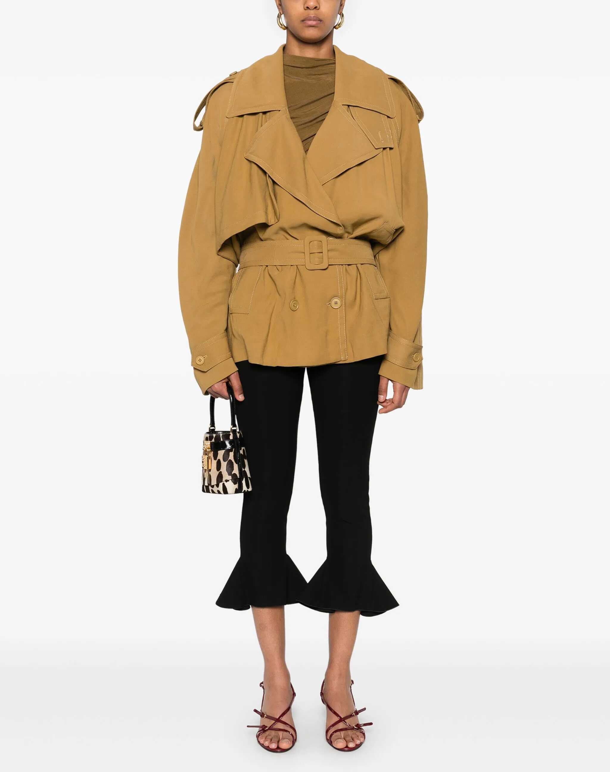 The double-breasted short Trench Coat by The Andamane is an elegant and versatile design. Featuring a wide lapel, this trench coat has long sleeves with webbed cuffs, giving it a distinctive detail. The double-breasted front closure with adjustable buttons adds structure to the garment, while the two side welt pockets offer practicality without compromising style. An adjustable waistband allows for customization, while shoulder insignia adds a military-sophisticated touch to the overall look.