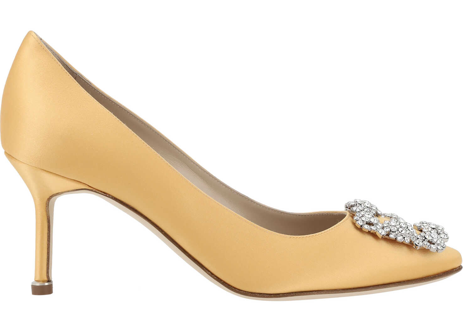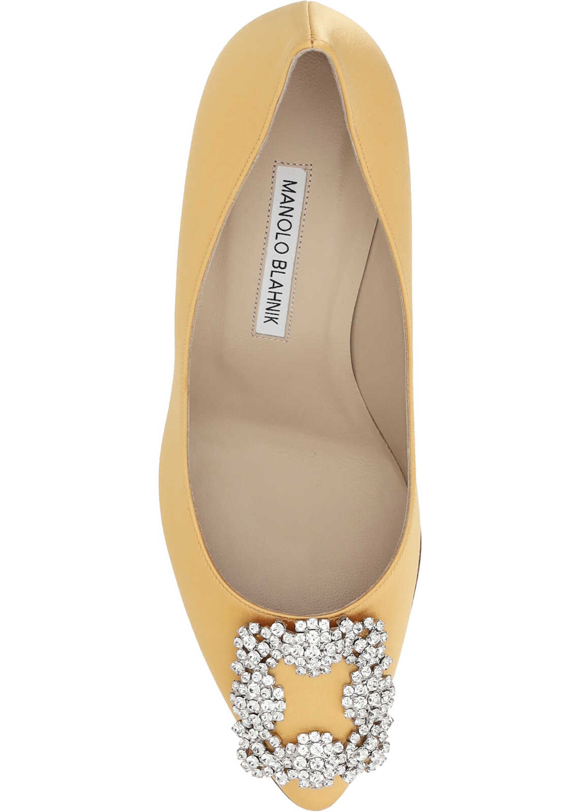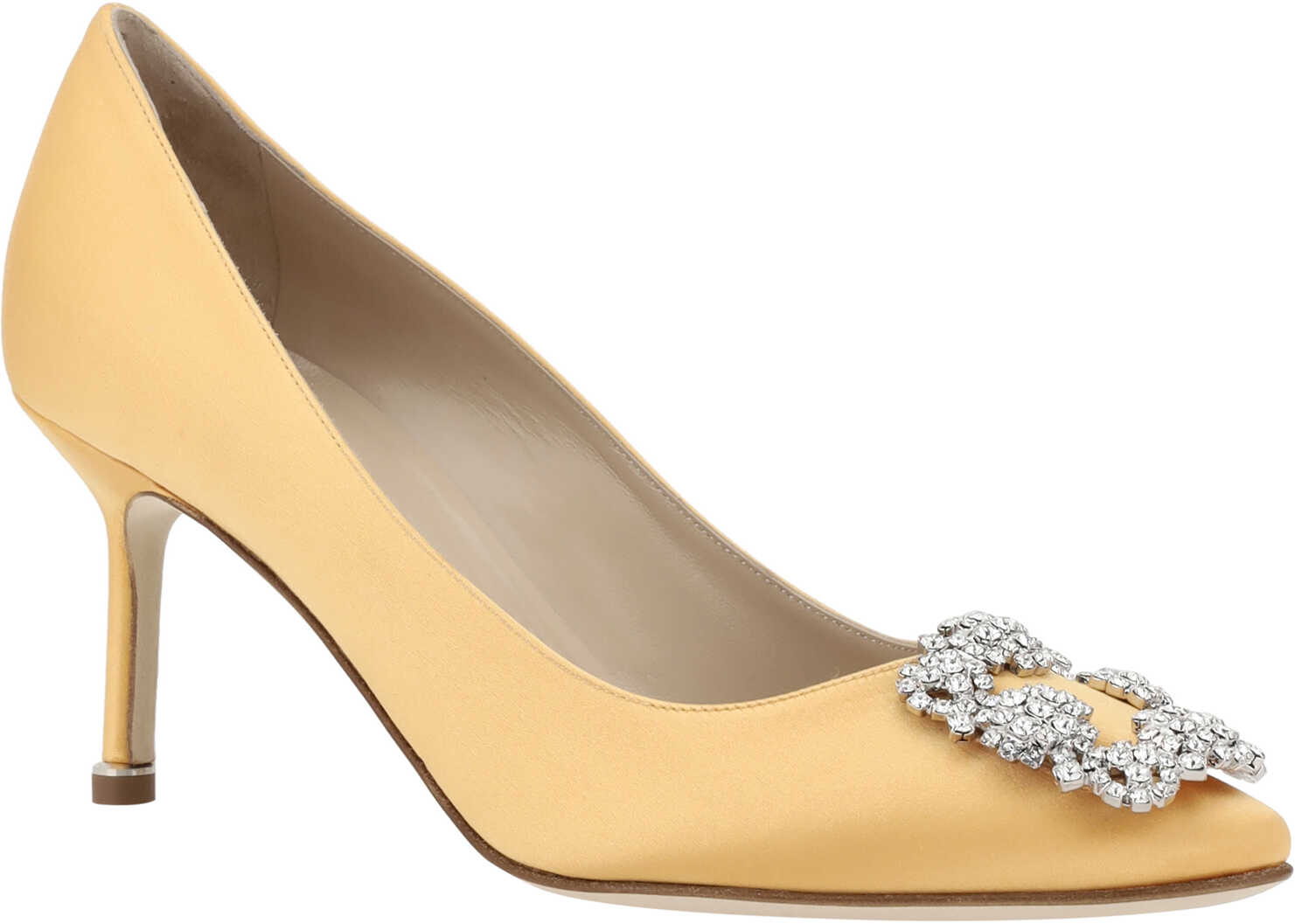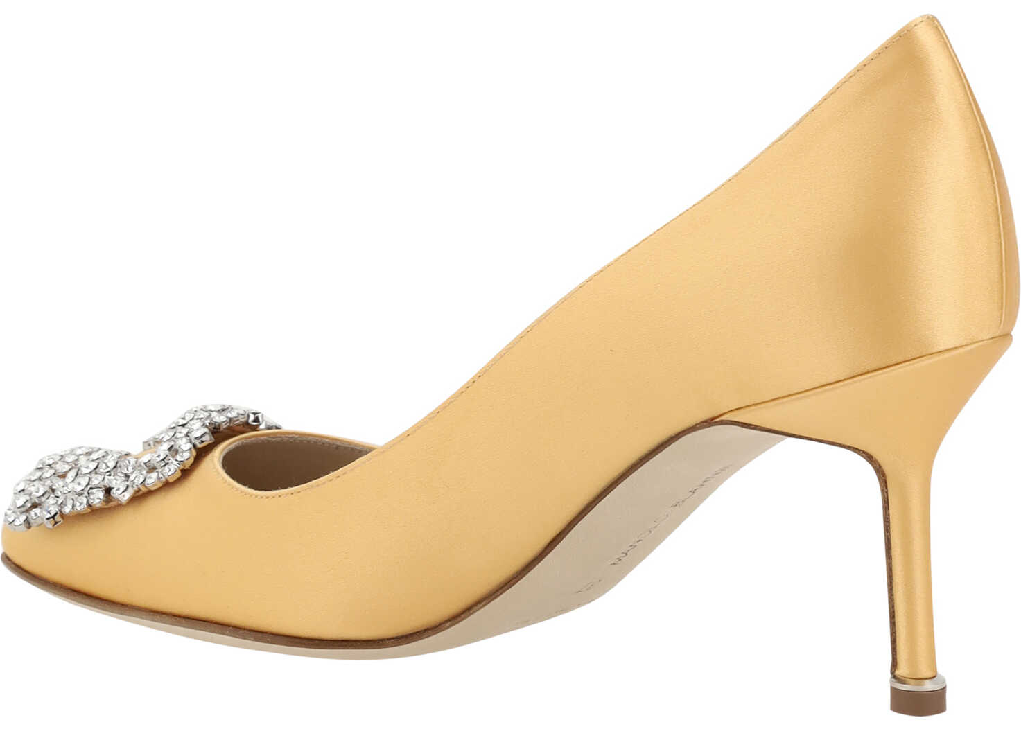 Silk Satin Hangisi Pumps by Manolo Blahnik, almond toe, iconic Swarovski crystal buckle appliqué on front, leather stiletto heel, logo-embossed insole.